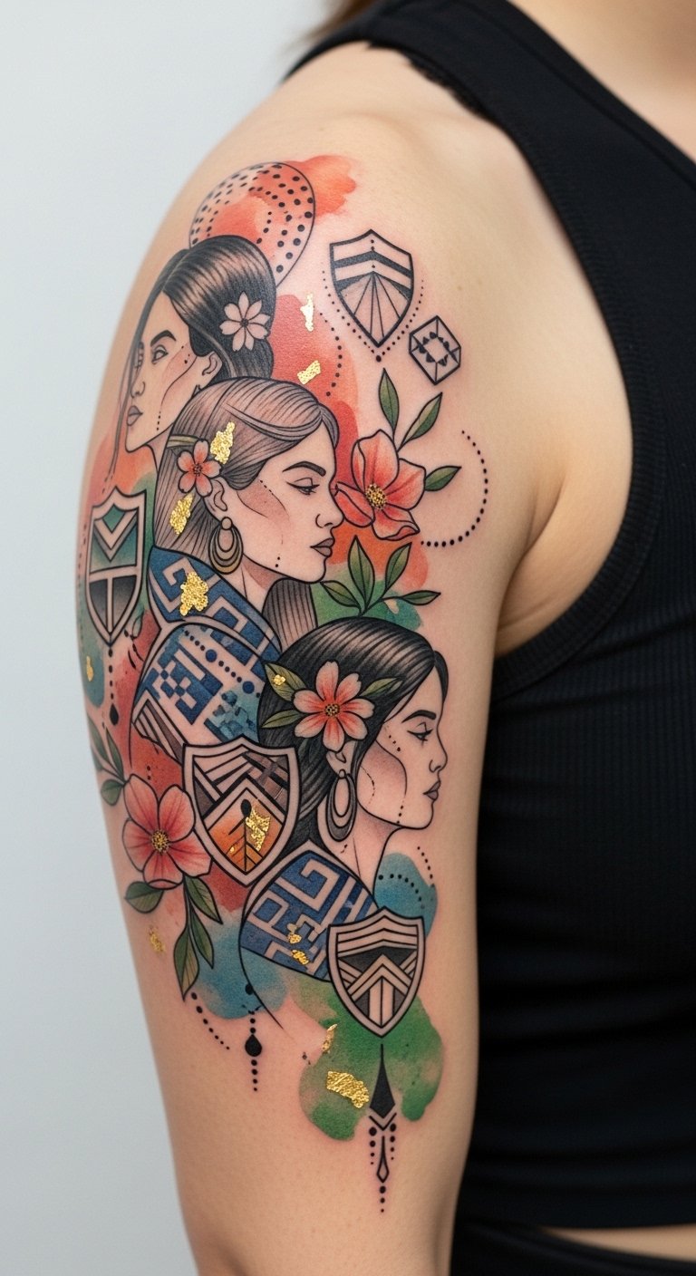 The watercolor palette evokes warmth and continuity, while dotwork and gold highlights add refinement and sacredness. Emotionally the piece aims to inspire pride, resilience, and contemplative reverence. Ideal placement is the upper arm and shoulder where the wrap of the half-sleeve allows narrative flow, visibility when desired, and easy concealment for formal settings.