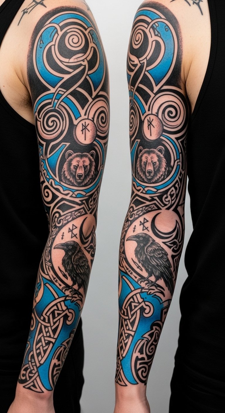 The design channels the legacy described, translating the Picts’ elaborate body art into a cohesive sleeve that honors identity, social status, and tribal affiliation through symbolic motifs: spirals for continuity, knotwork for interconnectedness, animal totems for strength and guidance, and woad-like blue for ceremonial freedom.