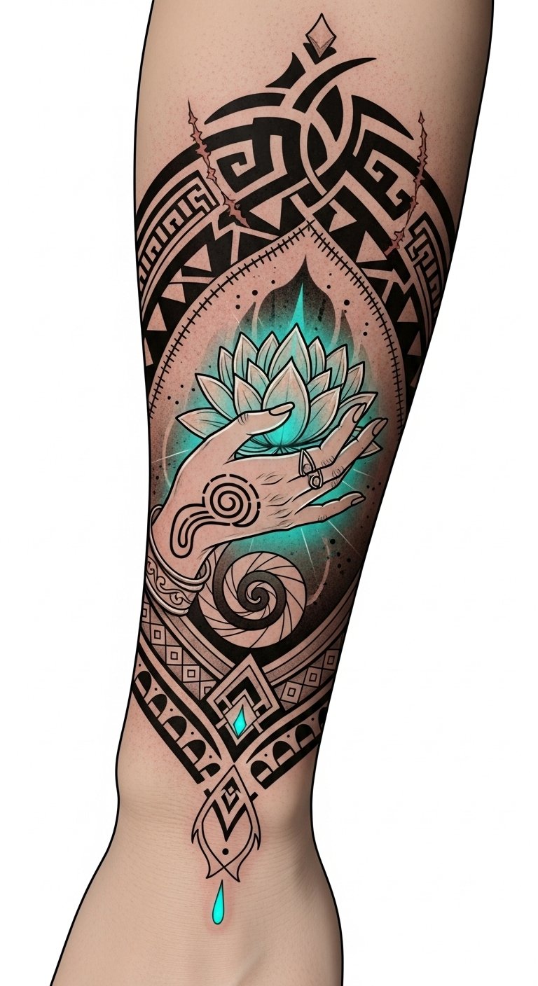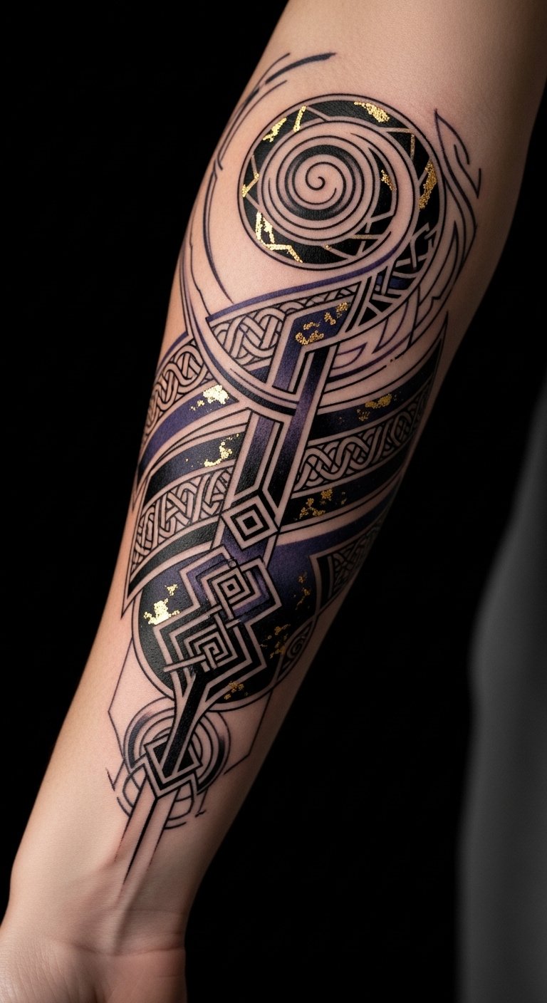This design merges a stylized spiral knot (ancient symbol of continuity) with geometric lines and watercolor washes, layered with fine-line cultural motifs and a faint script of a personal word; it should feel both timeless and fresh, evoking resilience and rebirth. Emotionally, it conveys reverence for ancestry and confident self-expression—comforting, empowering, and intimate. Ideal placements: inner forearm or upper back where the piece can be both visible and private, contours flowing with musculature to suggest movement and life.