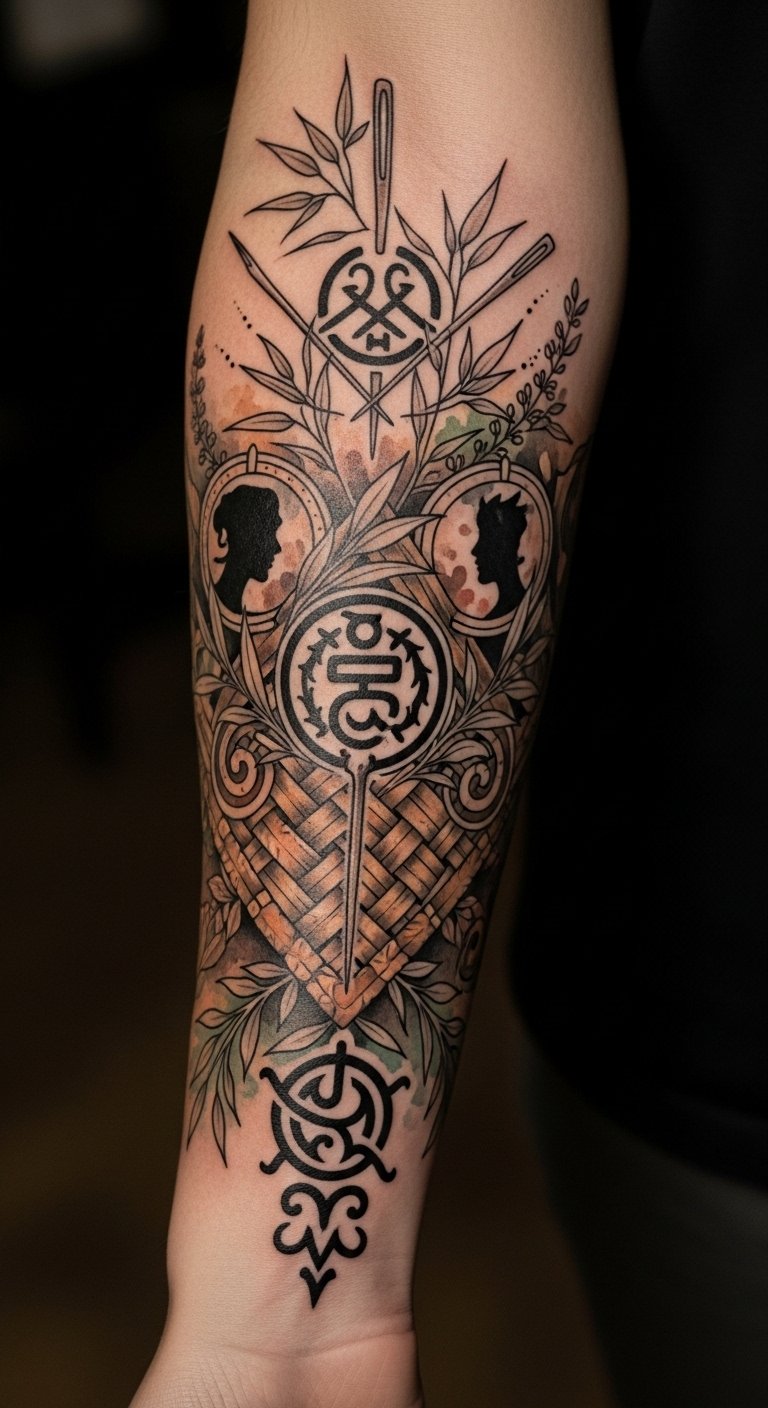 Place along the inner forearm or calf where movement animates the vines and silhouettes; the symbols evoke communal memory and personal resilience, the color palette conveys warmth and rootedness, and the negative space allows breath between stories, creating an intimate emotional anchor.