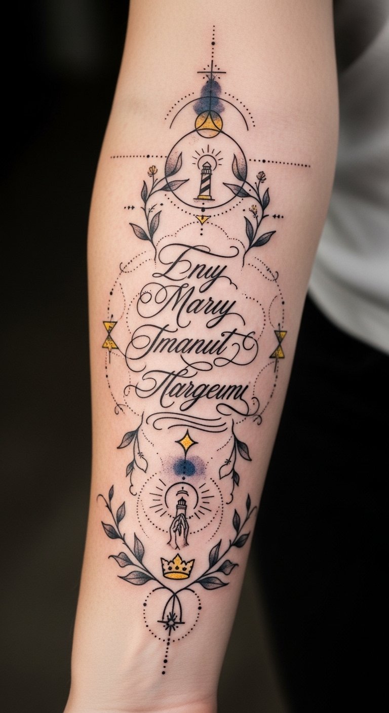 These tattoos serve as powerful reminders of your journey, reflecting an unbreakable bond with the divine, and transforming your style into a canvas of spiritual devotion and personal freedom. The design uses the exact text as the focal element, turning words into visual scripture that runs along the forearm, while surrounding motifs amplify themes of protection (halo, crown), guidance (lighthouse), and unity (clasped hand).