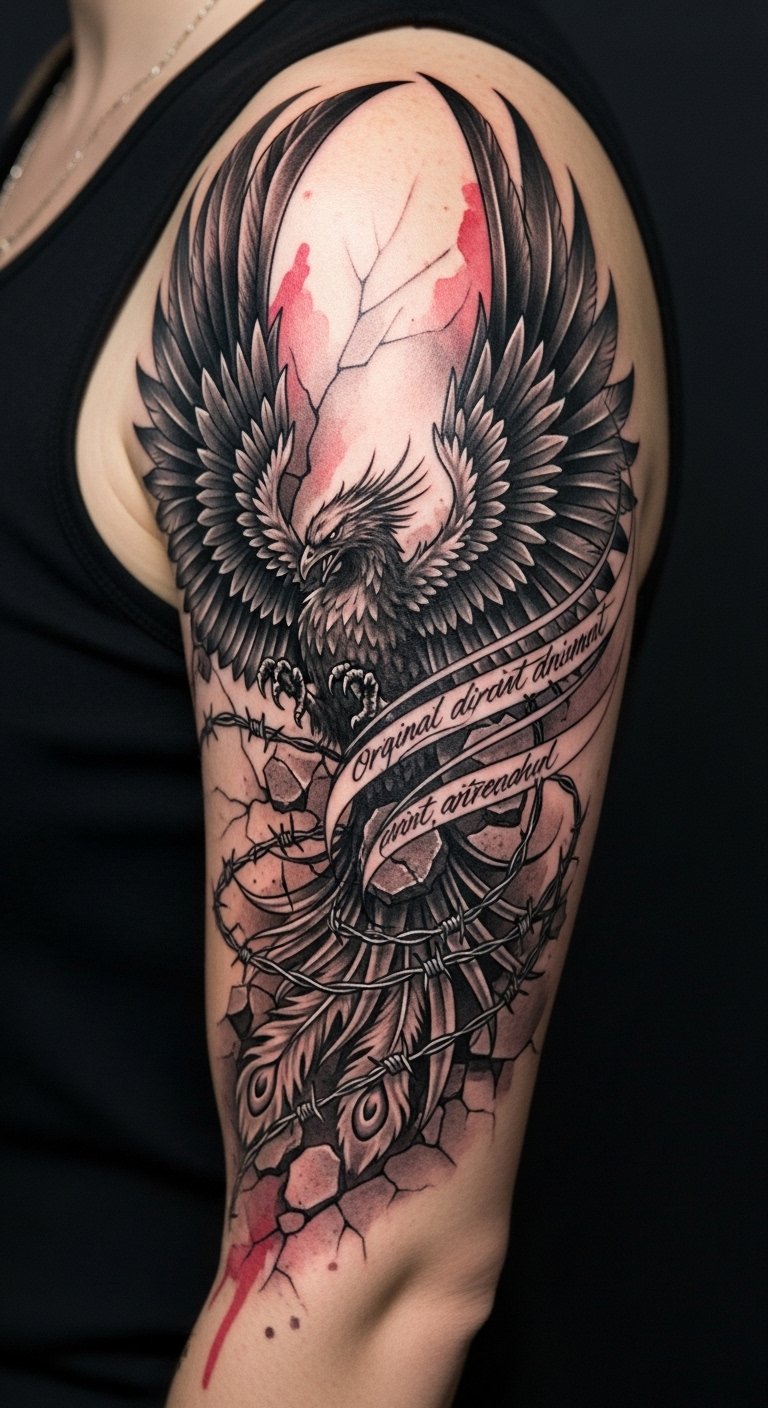 The phoenix rising from cracked stone and barbed wire symbolizes rebirth from hardship and the endurance of spirit; geometric wing patterns convey structure and inner discipline while the original text woven subtly into feathers ties personal narrative to visual metaphor.
