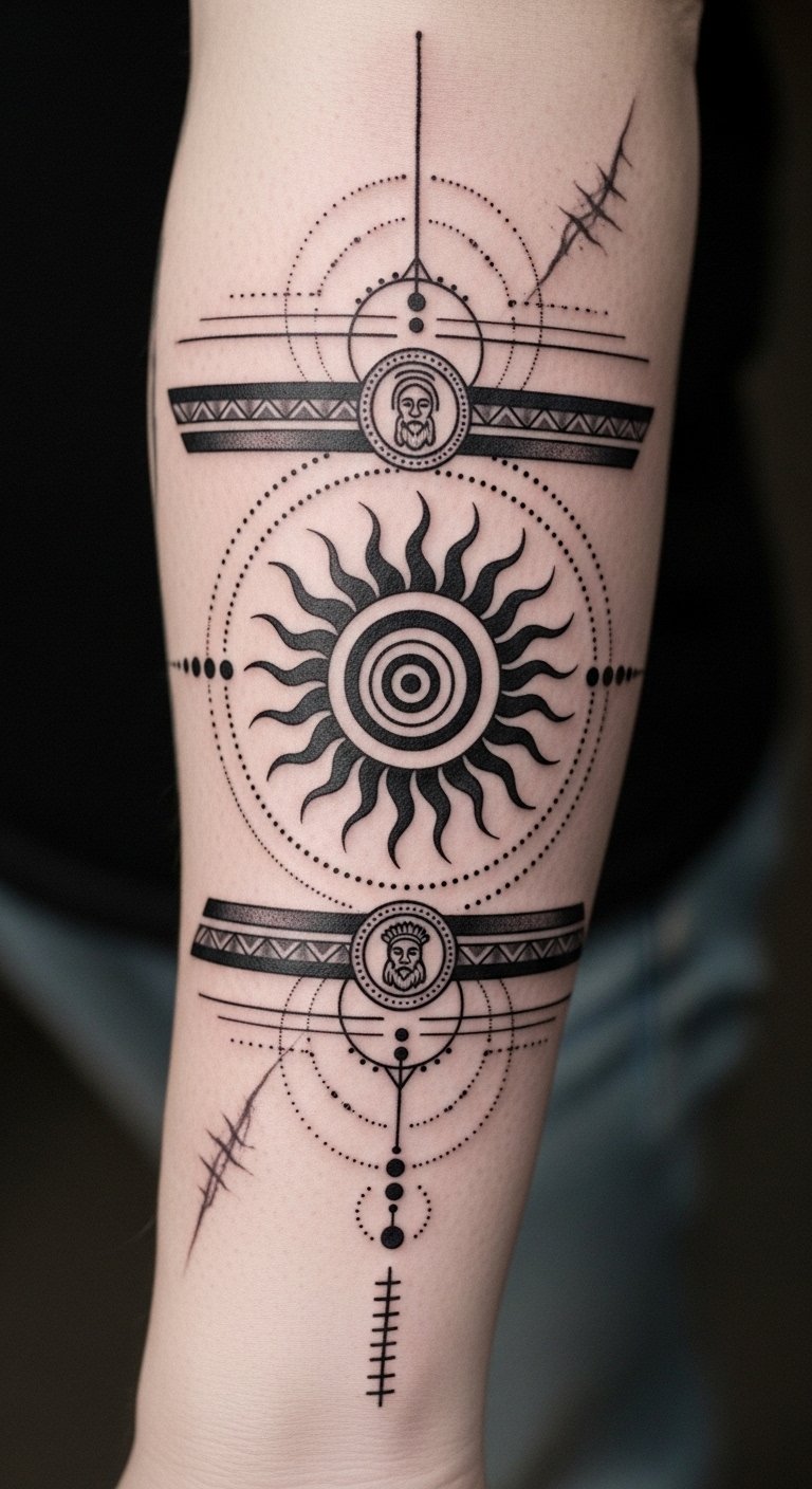 Fine dotwork and scar-like lines evoke age-old techniques and emotional weight, suggesting resilience and belonging. Designed for the outer forearm where it can be both private and visible during ceremonies, the piece balances bold sacred motifs with delicate detailing to convey power, reverence, and unity with the wearer’s cultural heritage.