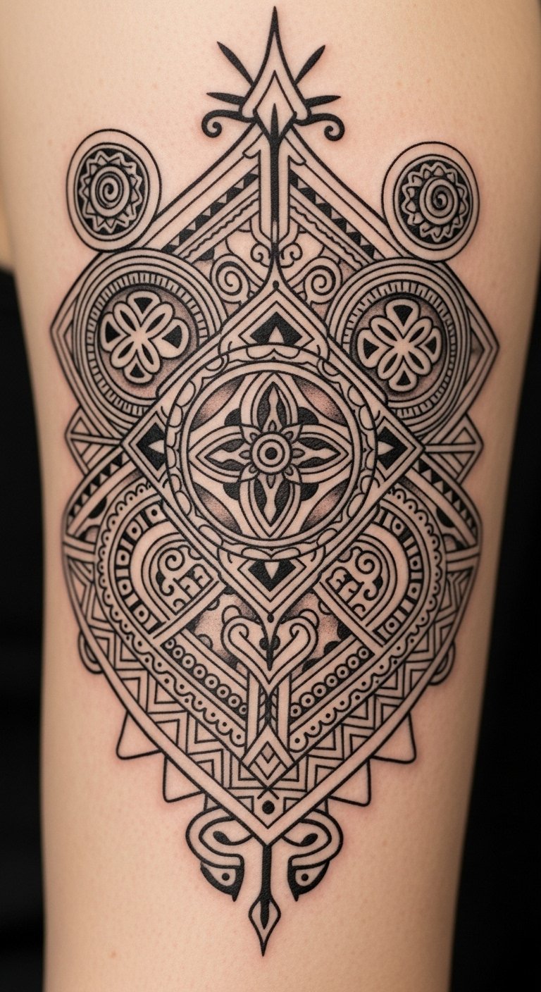 Emotionally it evokes pride, belonging, and ancestral connection; placement along the arm follows muscle lines to suggest movement and protection while allowing negative space to echo the balance between individuality and community.