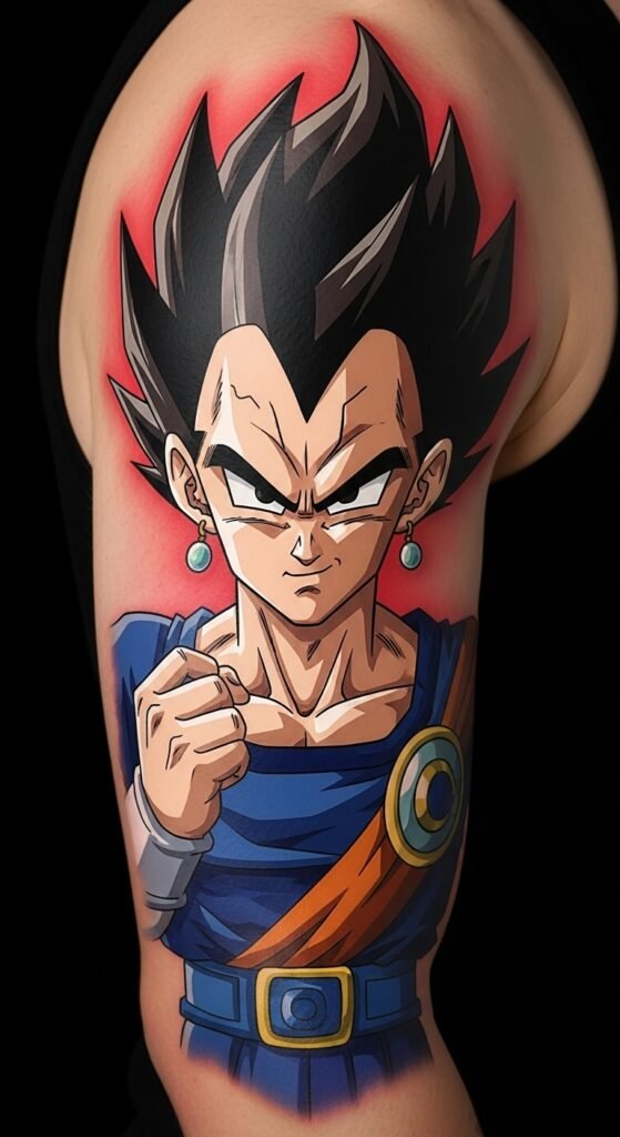 A bold forearm or chest piece centered on Vegeta in mid-transformation—Super Saiyan or Blue—surrounded by stylized broken armor plates and flowing energy auras that echo his legacy; incorporate small script of an iconic quote along the collarbone or inner wrist and subtle silhouettes of his family in the background to highlight bonds. The design symbolizes disciplined pride, internal struggle, and growth, intended to evoke fierce determination and honor; place on the chest for intimate meaning or forearm/upper arm for visible pride and daily motivation.