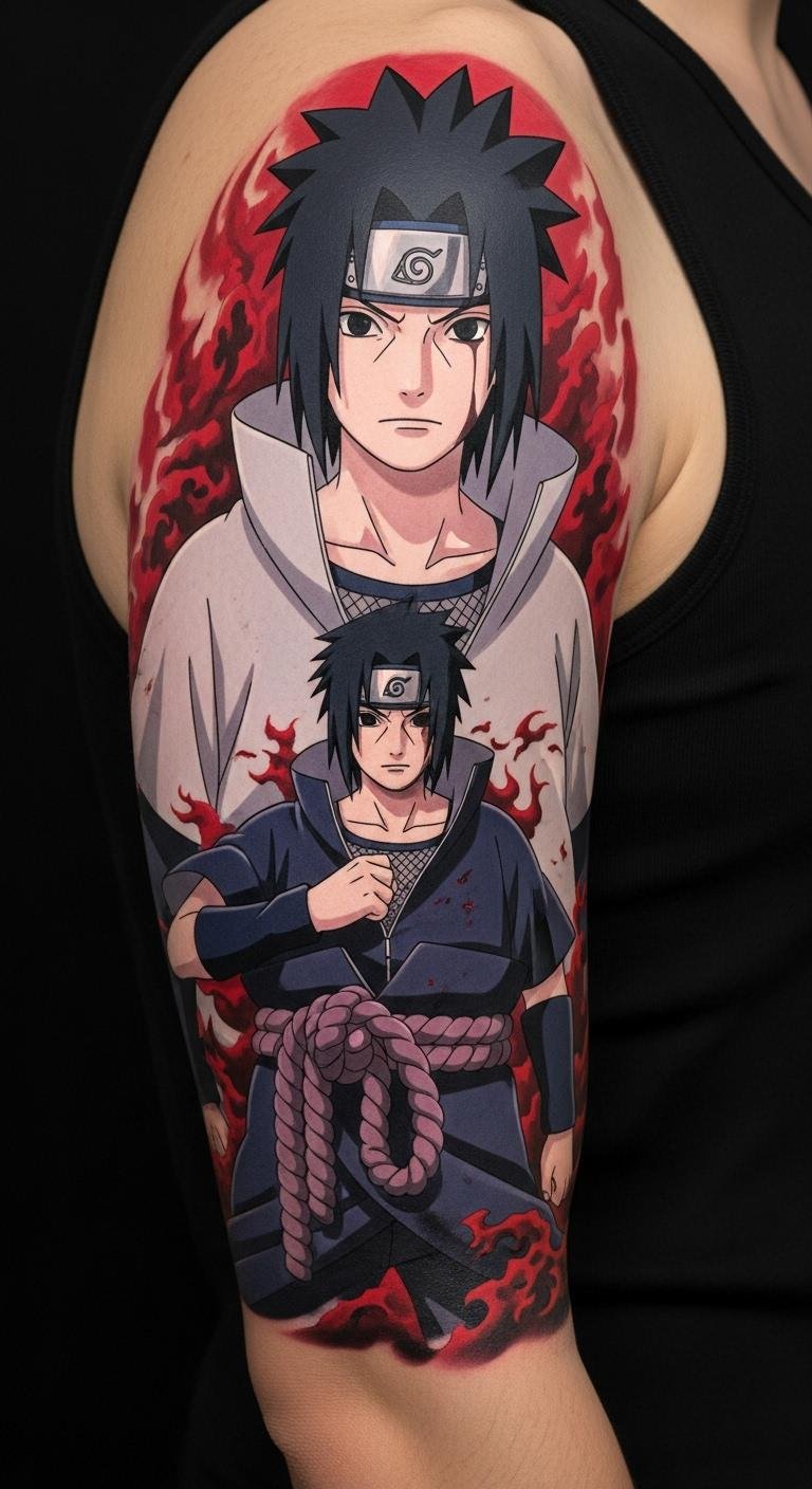 A tattoo design centered on a stylized Sasuke silhouette split between shadowed Sharingan motifs and softer, healing elements like subtle sakura petals or a faint glow to represent redemption; use contrasting black and deep indigo with hints of crimson in the eye area for emotional intensity. The composition symbolizes the tension between vengeance and growth, conveying solitude, resilience, and eventual transformation. Place on the upper back, shoulder blade, or inner forearm where the split imagery can follow natural muscle lines, allowing the wearer to reveal or conceal the narrative as an intimate expression of identity.