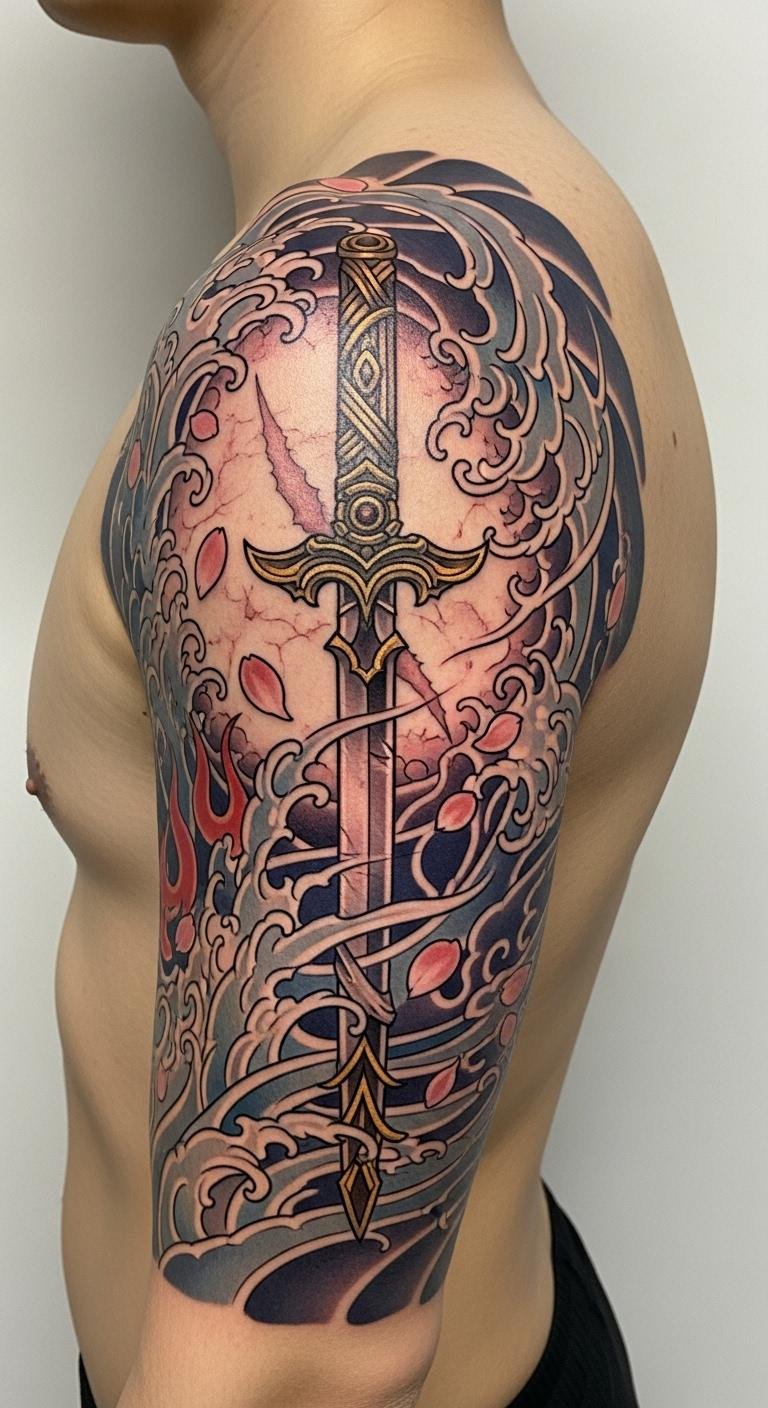 The design combines elemental motifs to represent each attribute—water for calm resolve, fire for fierce protection, wind for fleeting sacrifice—integrated with the blade and scars to signify battle-worn perseverance; placed on the upper arm/shoulder, it reads as a personal banner of strength visible in moments of action and reflection.