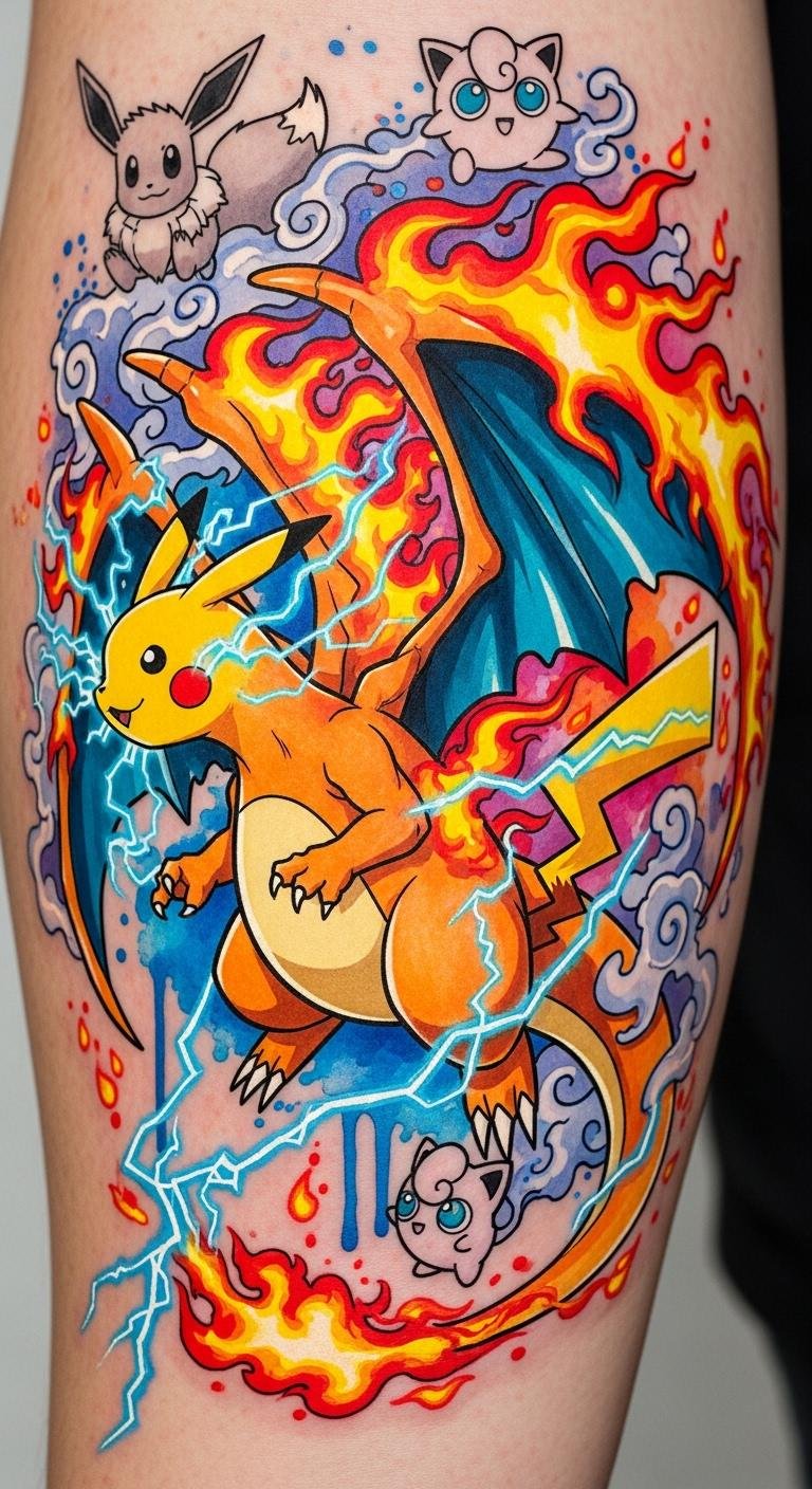 This design celebrates the joy of fandom through bright, energetic imagery: Pikachu’s playful spark combined with Charizard’s fierce flame speaks to both warmth and power, while the faint Eevee and Jigglypuff shapes honor versatility and softness.