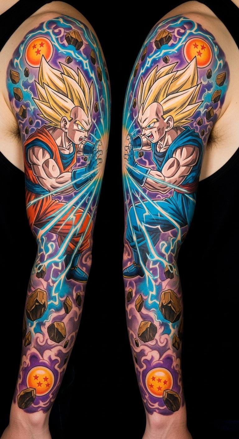 Emotionally intense and heroic, the sleeve suits a full-arm wrap from wrist to shoulder, with the clash centered on the outer forearm for visibility and the Dragon Balls ascending toward the shoulder to symbolize progression and personal growth.