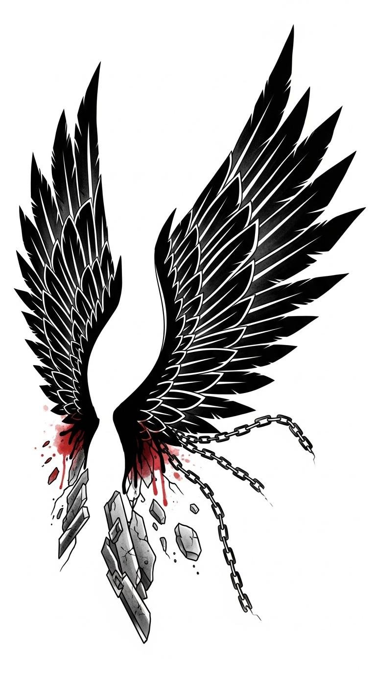 Placement over the upper back centers the wings along the shoulder blades to evoke a protective, expansive feeling; on the forearm it reads as a personal statement visible in motion, while the fragmented chains and wall fragments emphasize breaking barriers.