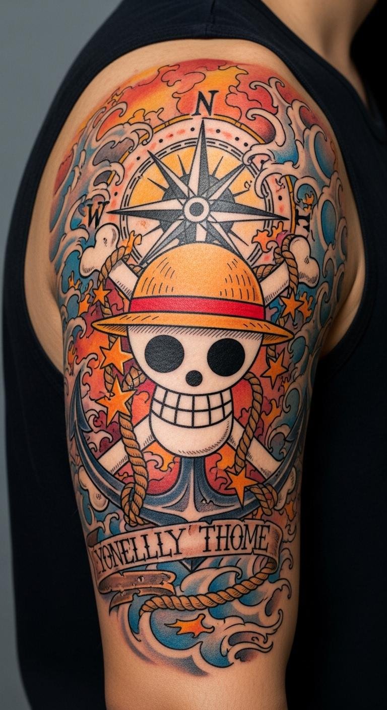 This design places the iconic skull-and-straw-hat motif at the center, anchors-as-bones and a compass rose framing it to evoke guidance and maritime freedom; ropes, nautical stars, and rolling waves add motion and connectivity, while a wind-swept banner introduces a personal motto.