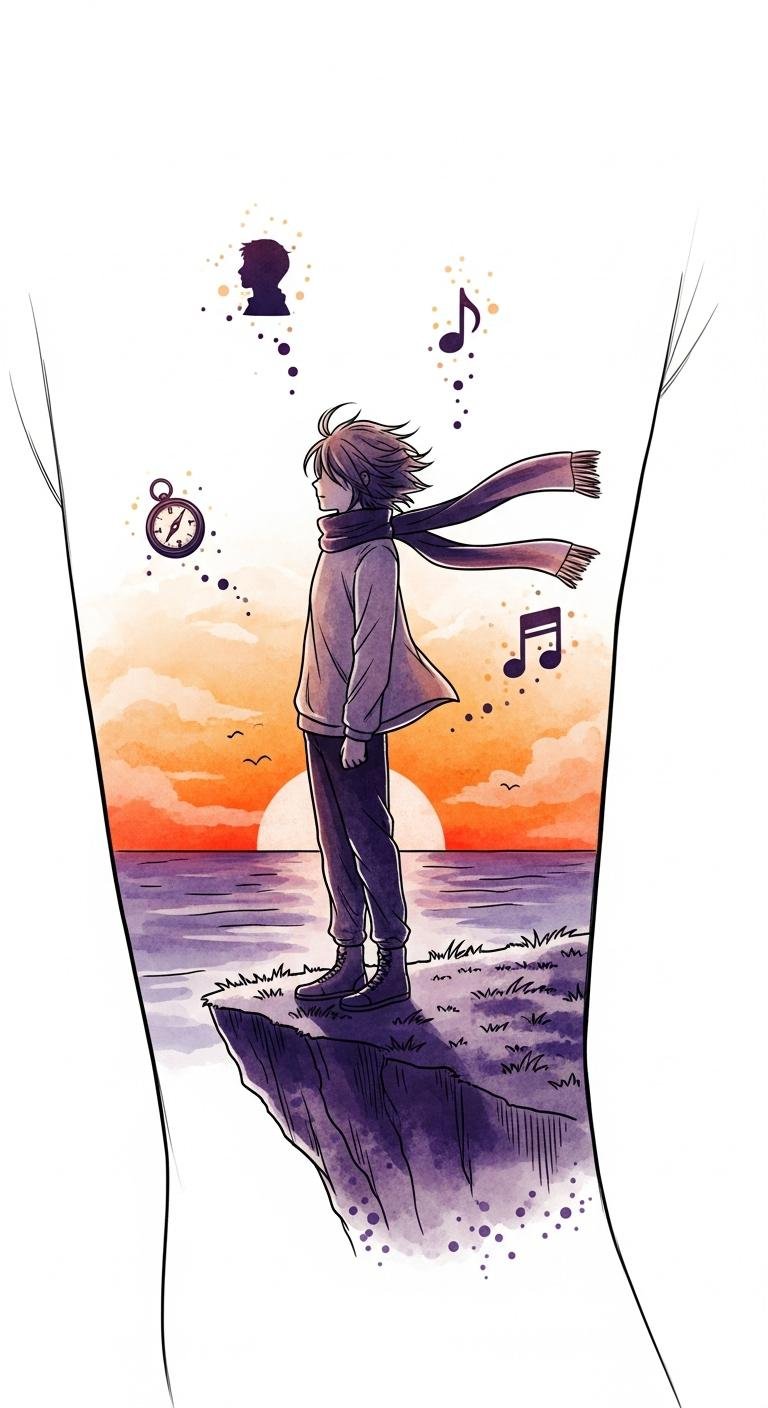 This design blends the contemplative solitude of the figure and the warmth of sunset tones to symbolize personal growth, direction, and creative passions; the floating icons are intimate markers of identity and memory.