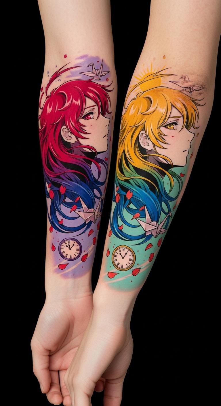 This concept envisions a composed anime scene that adapts to different canvases—a dynamic character mid-stride with flowing hair and symbolic motifs (wind, petals, small celestial elements) arranged to suit forearm, shoulder, sleeve, ankle, or wrist placement; rendered in clean linework with selective color accents and varying scale for visibility. Symbolically, the moving figure and drifting motifs express personal narrative and freedom; emotions range from determined boldness on the forearm or full sleeve to quiet intimacy on the shoulder or wrist. Placement choices reflect lifestyle: visible placements project confidence and storytelling, discreet spots preserve private meaning.