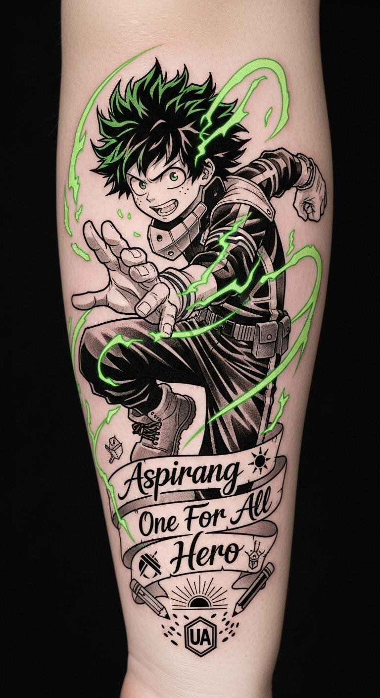 A Midoriya tattoo captures not just his iconic poses but the essence of aspiring for greatness, reminding you of your own inner strength and dreams.