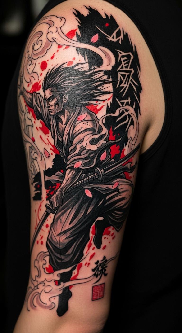 The design channels Mugen’s raw energy through aggressive brushstrokes and contrasting ink splashes, symbolizing rebellion, freedom, and the fusion of tradition with personal chaos; emotionally it evokes defiance and fierce vitality, meant to be placed where movement and visibility enhance narrative—along the arm as a dynamic sleeve or across the upper back so the figure’s leap follows the body’s contours and reads clearly in motion.