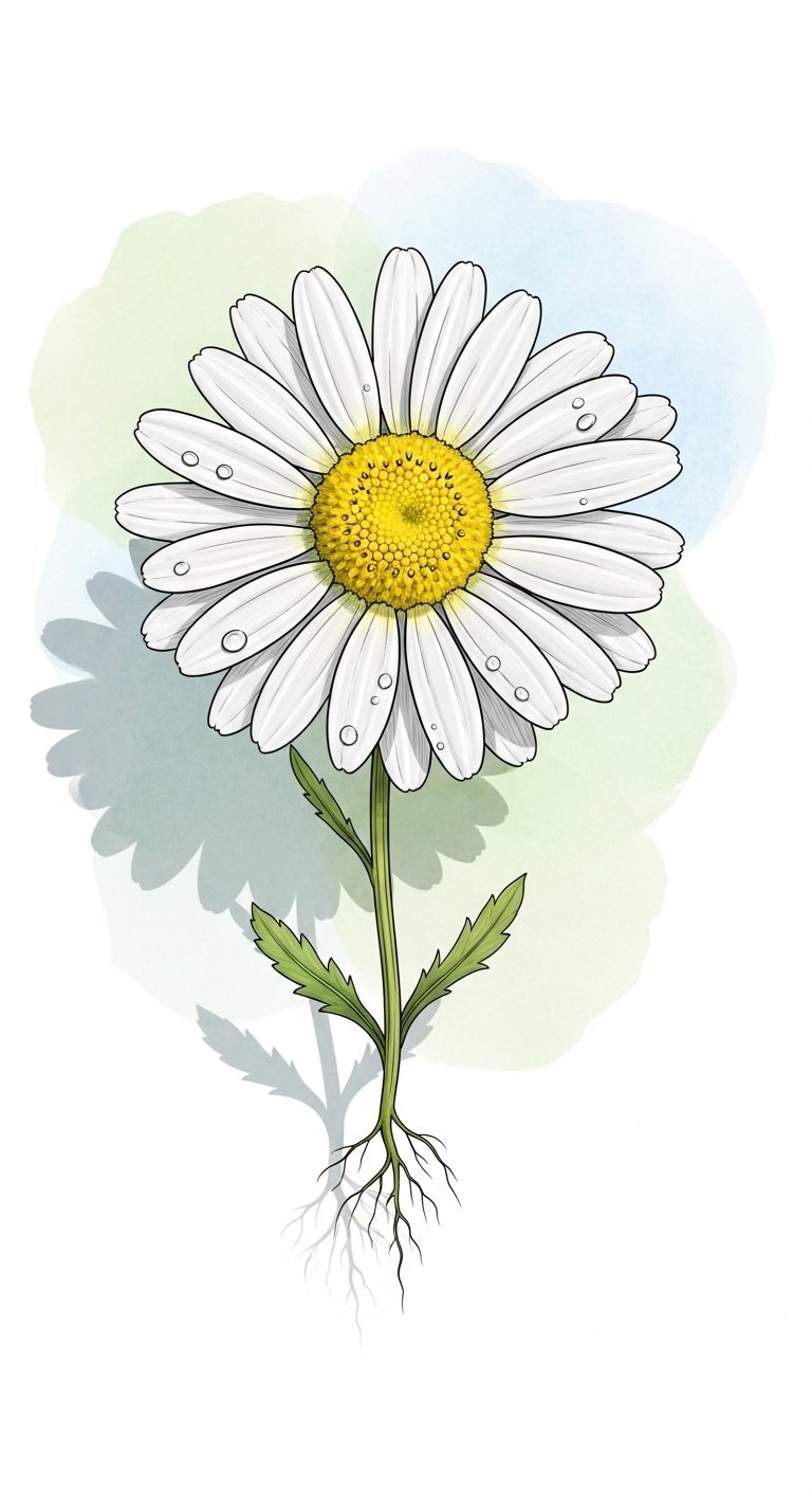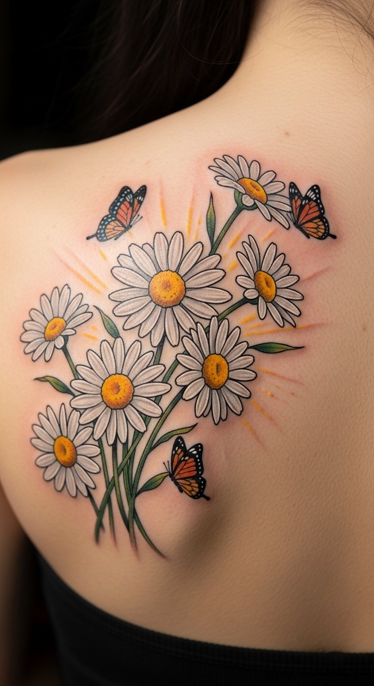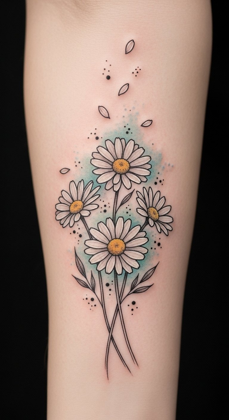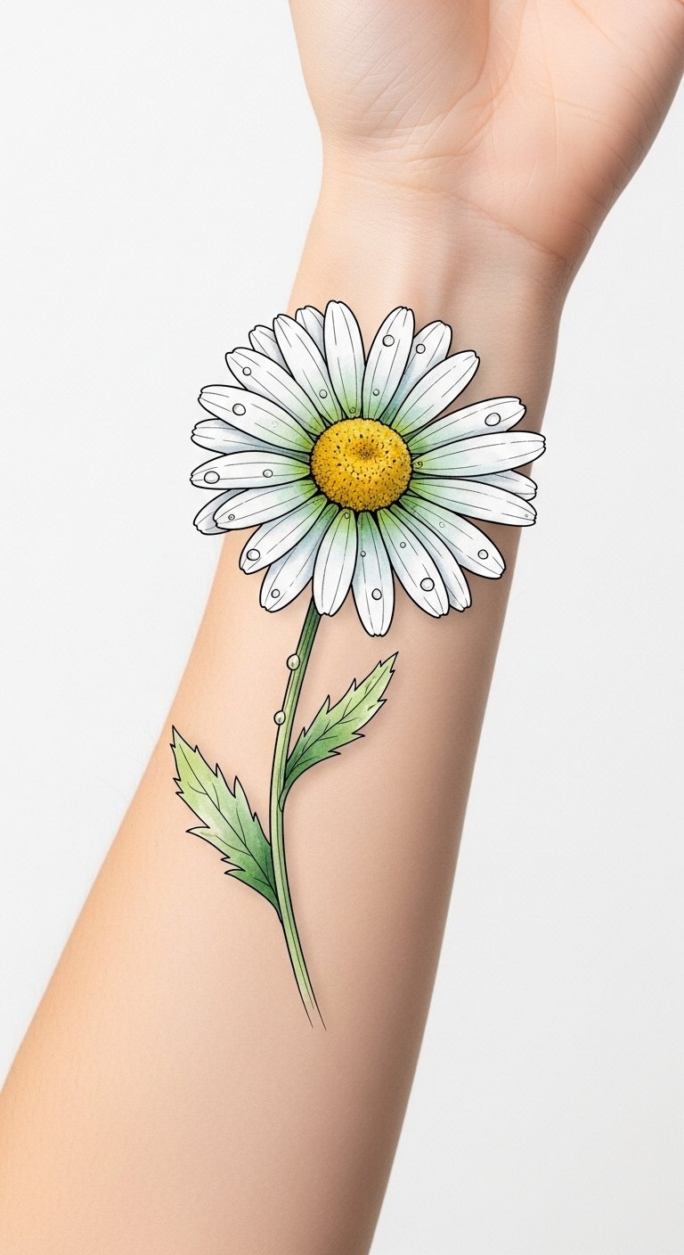 Use this concept to create a mid-forearm or shoulder blade tattoo: a realistic daisy with soft white petals and a warm golden center, subtle watercolor washes in pastel tones reflecting the wearer’s favorite colors, a small butterfly alighting on one petal, and delicate sunray lines extending outward. Symbolically, the daisy represents purity and innocence while the chosen colors and added elements (butterfly for transformation, sunrays for vitality) personalize the meaning and evoke gentle optimism; emotionally it reads as hopeful and intimate, suited to visible placements like the forearm for daily reminder or the shoulder blade for a more private, graceful display.