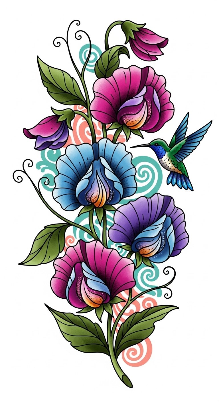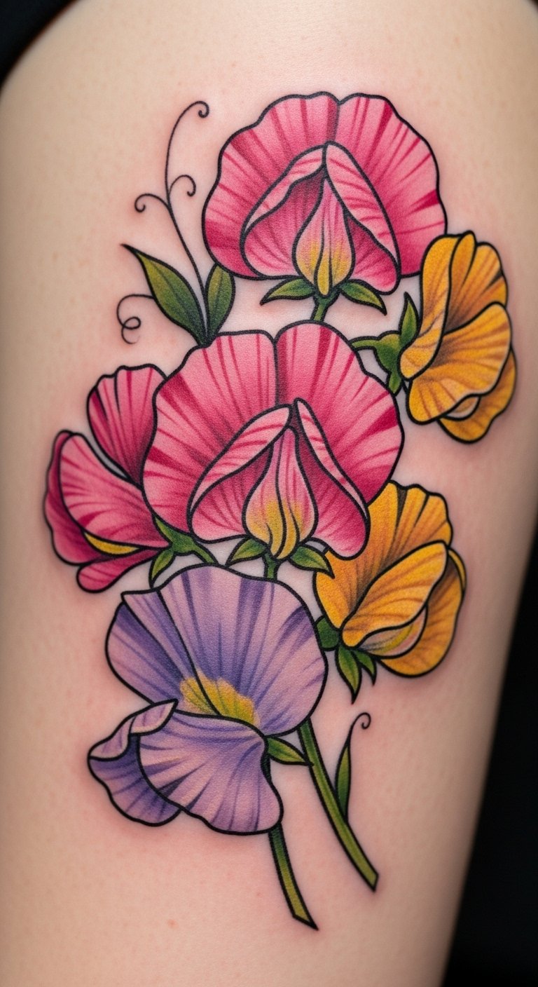 Sweet peas here symbolize personal growth, delicate resilience, and the joy of self-expression; the neo-traditional style emphasizes bold outlines and saturated colors to make these themes feel both timeless and modern.