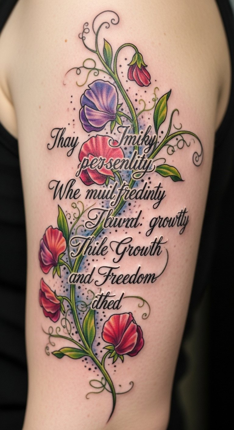 The design concept centers on delicate sweet pea blossoms with a chosen line of text integrated visually: vines curl naturally to cradle cursive lettering or frame bold block type, allowing the words to feel as much part of the plant as the petals. Symbolically, the sweet peas represent tenderness, renewal and gentle strength, while the personalized text anchors the piece in personal narrative—commemorating milestones, values, or a loved one. Emotionally the tattoo reads as intimate and hopeful; placement suggestions include the inner forearm or ribcage for a private, tender statement, or the outer shoulder and calf for a more visible declaration of growth and freedom.