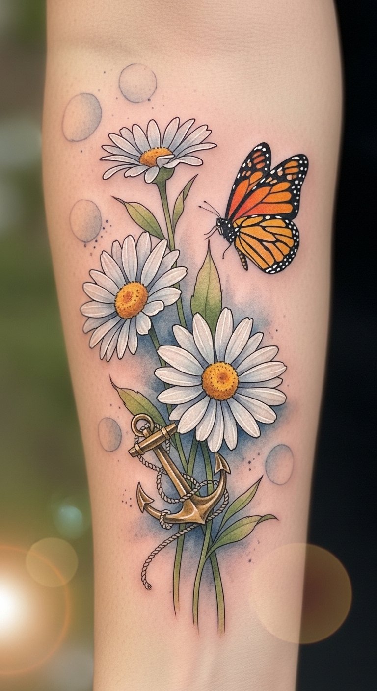 The design balances innocence (daisies), change (butterfly), and steadiness (anchor), evoking hope, growth, and grounding; placed along the inner forearm or wrist the composition reads clearly and can be sized to feel intimate or extended upward for a sleeve continuation.