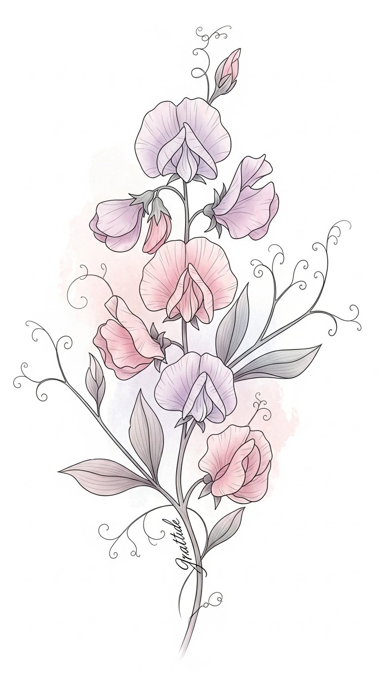 These delicate sweet pea blooms capture the original text’s message of gratitude, each inked petal symbolizing appreciation for life’s blessings and cherished moments.