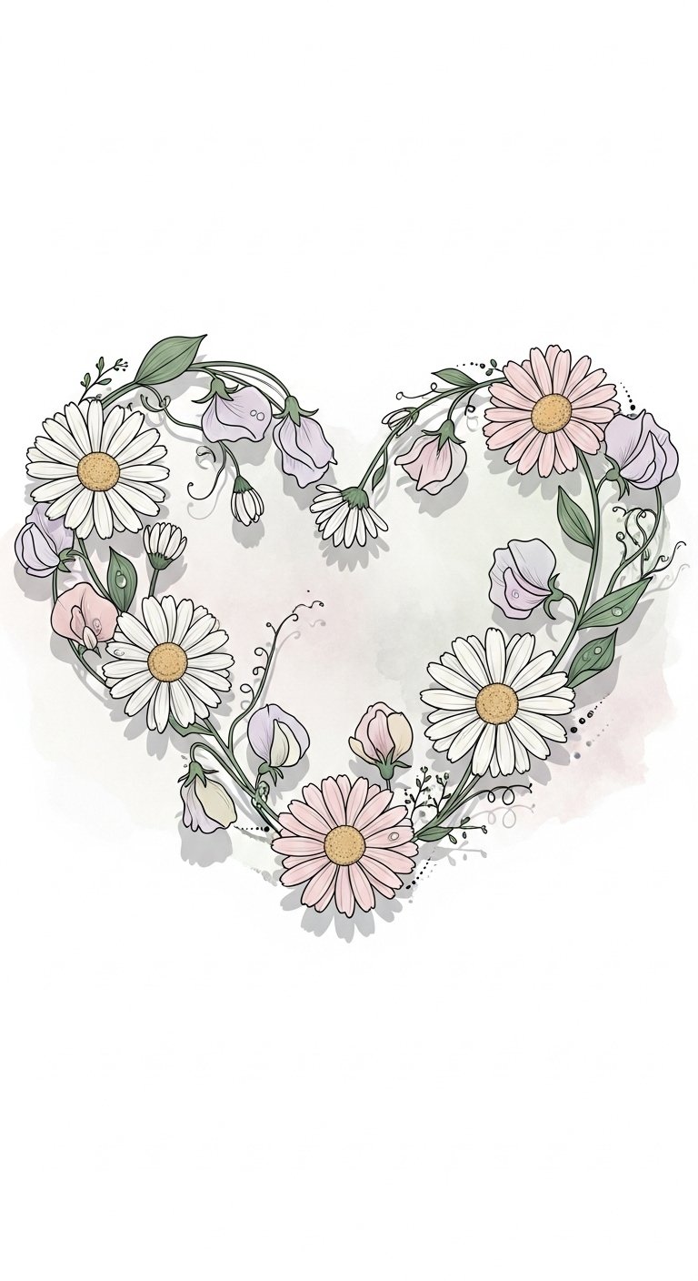 This design pairs the innocence of daisies with the blissful nostalgia of sweet peas to convey a journey from simplicity to fulfilled joy; soft watercolors and negative space evoke tenderness and openness while fine linework and dotwork add depth and continuity.