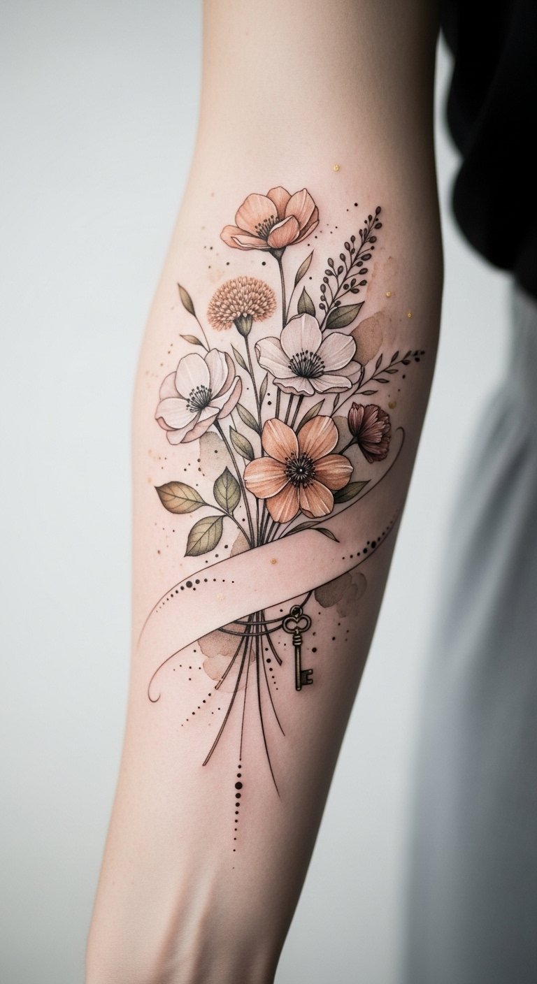 This design blends personal symbolism and intimate emotion: birth flowers represent identity and memory while the vintage key suggests unlocking personal stories or relationships.