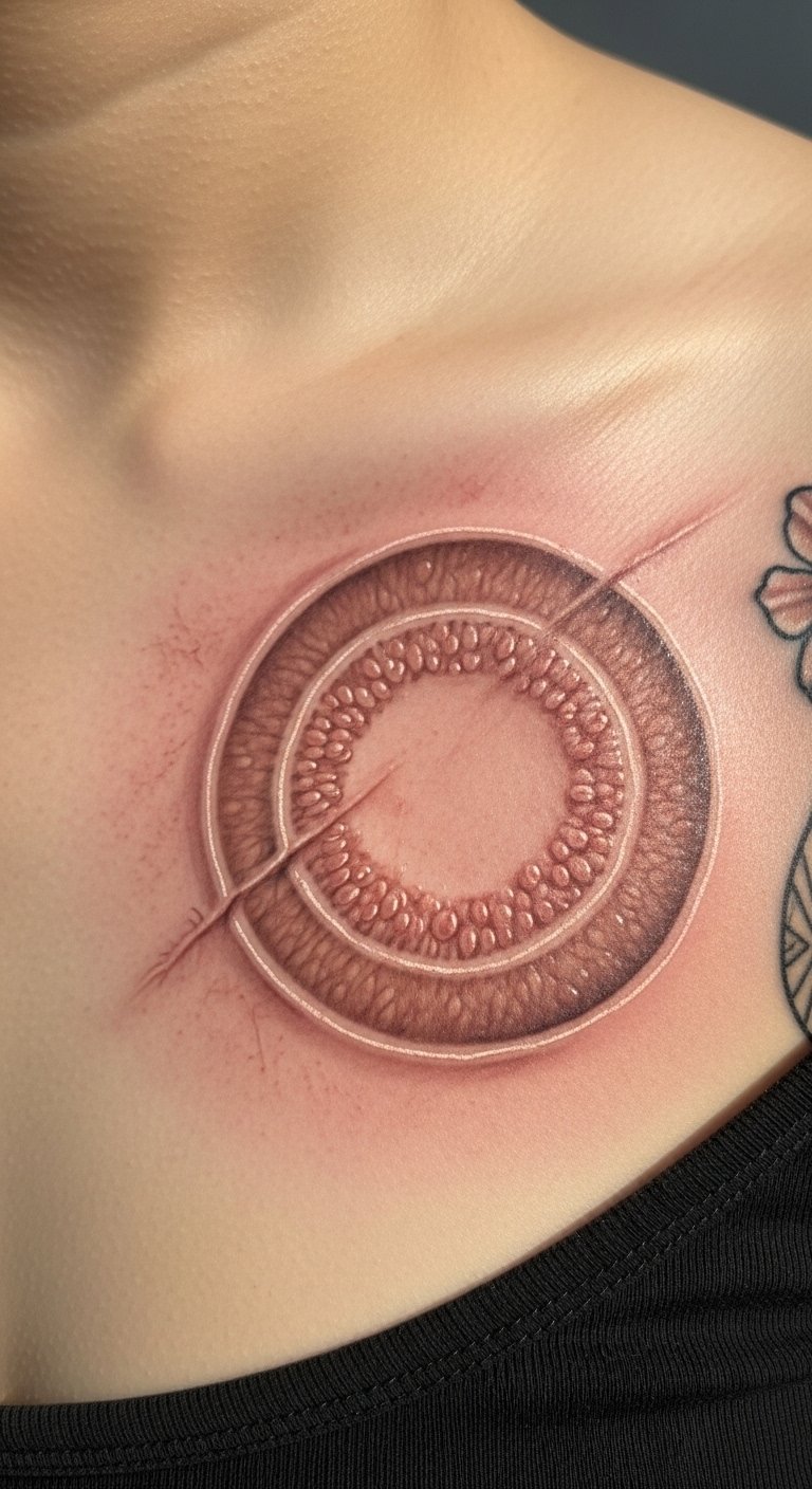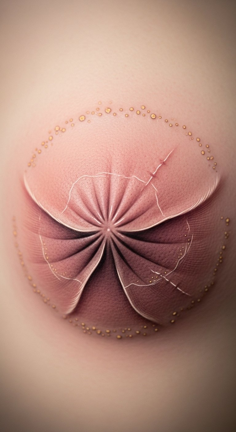 The feathered edges ensure seamless blending with surrounding skin, and the inclusion of faint scar highlights honors past trauma without erasing it, turning markers of survival into subtle aspects of beauty. The halo of translucent gold speaks to renewal and hope, meant for placement centered on the breast where it supports visual symmetry and intimate reclamation; sizing and pigment choice are adapted per client skin tone and healing considerations.