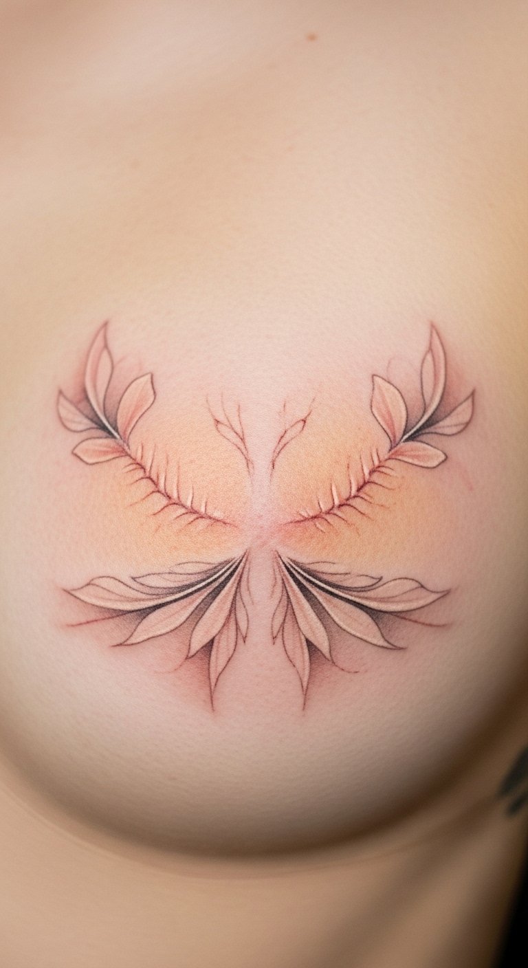 The design concept draws on restoration, resilience, and intimate care—symbolizing healing through artistry. Emotionally it aims to instill confidence and reclaim bodily autonomy, pairing soft, natural tones with subtle shading to evoke warmth and realism. Ideal placement centers on reconstructed or corrective areas of the breast where scar camouflage and optical depth are needed, with scale and pigment chosen to harmonize with surrounding skin and personal anatomy.