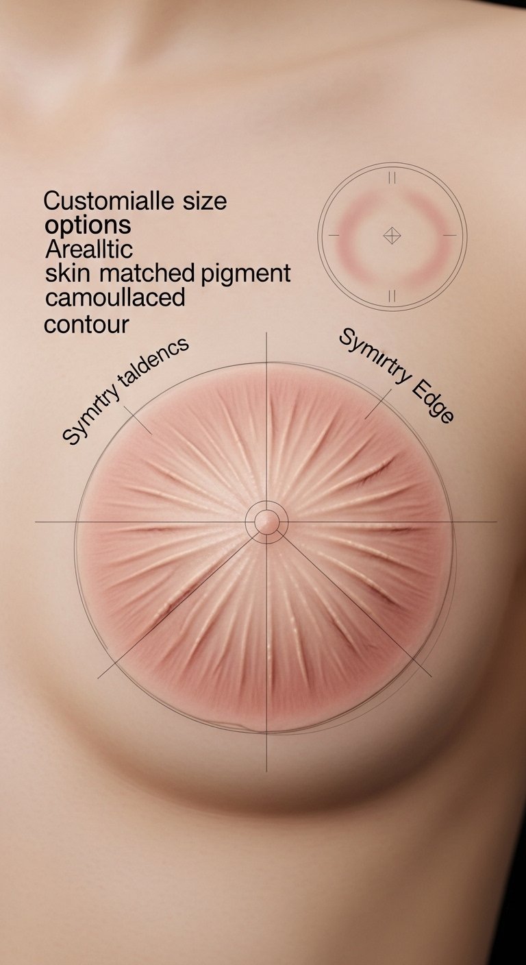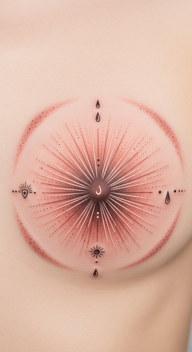 The design symbolizes restoration and self-acceptance, evoking quiet strength and gentle rebirth; placed concentrically over the nipple-areola complex and aligned to existing anatomy and scars, it conveys intimacy and resilience while honoring natural contours and skin tones.