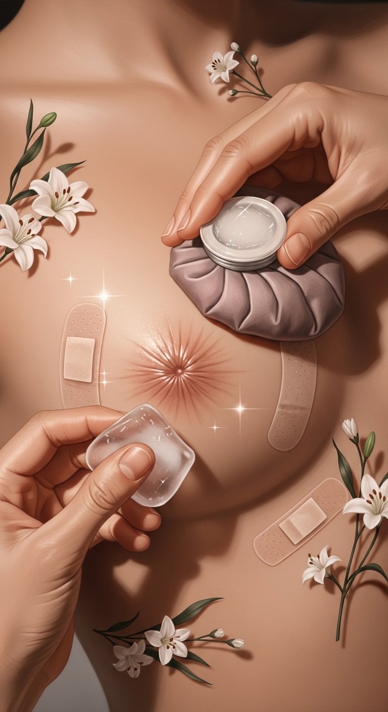 The placement centers the areola, affirming body-focused healing and intimacy, while the soft-focus surroundings convey privacy and emotional safety.
