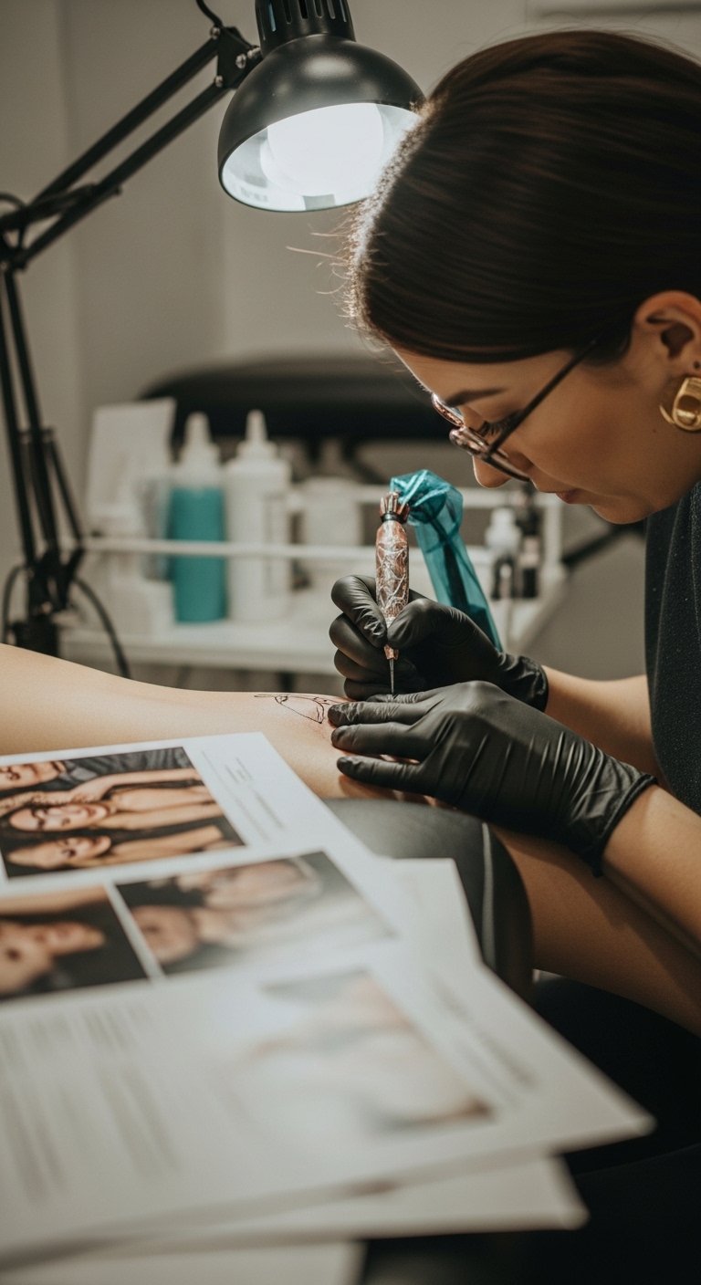 The image symbolizes care, professionalism, and personal empowerment; the artist’s steady hands and portfolio evoke trust and experience, while soft lighting and muted colors convey comfort and healing.