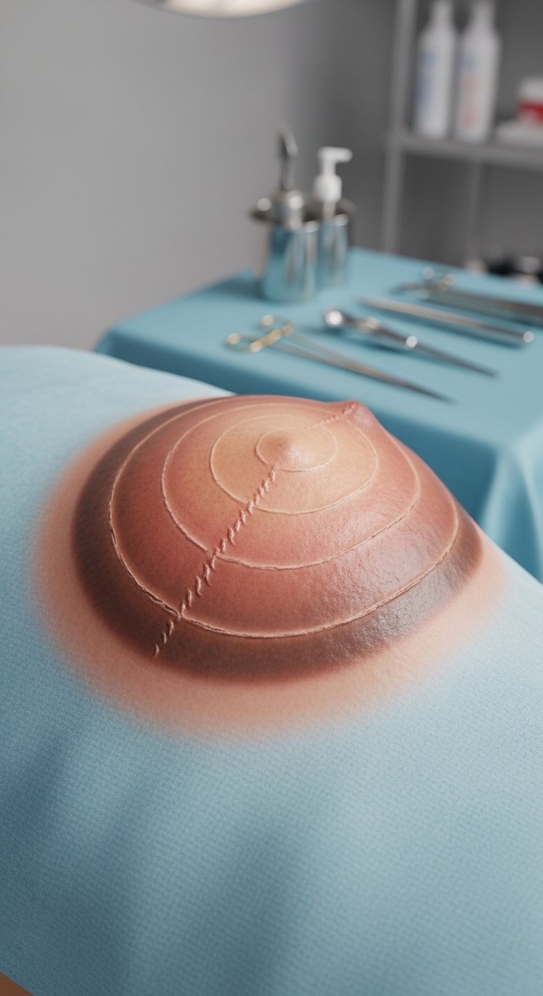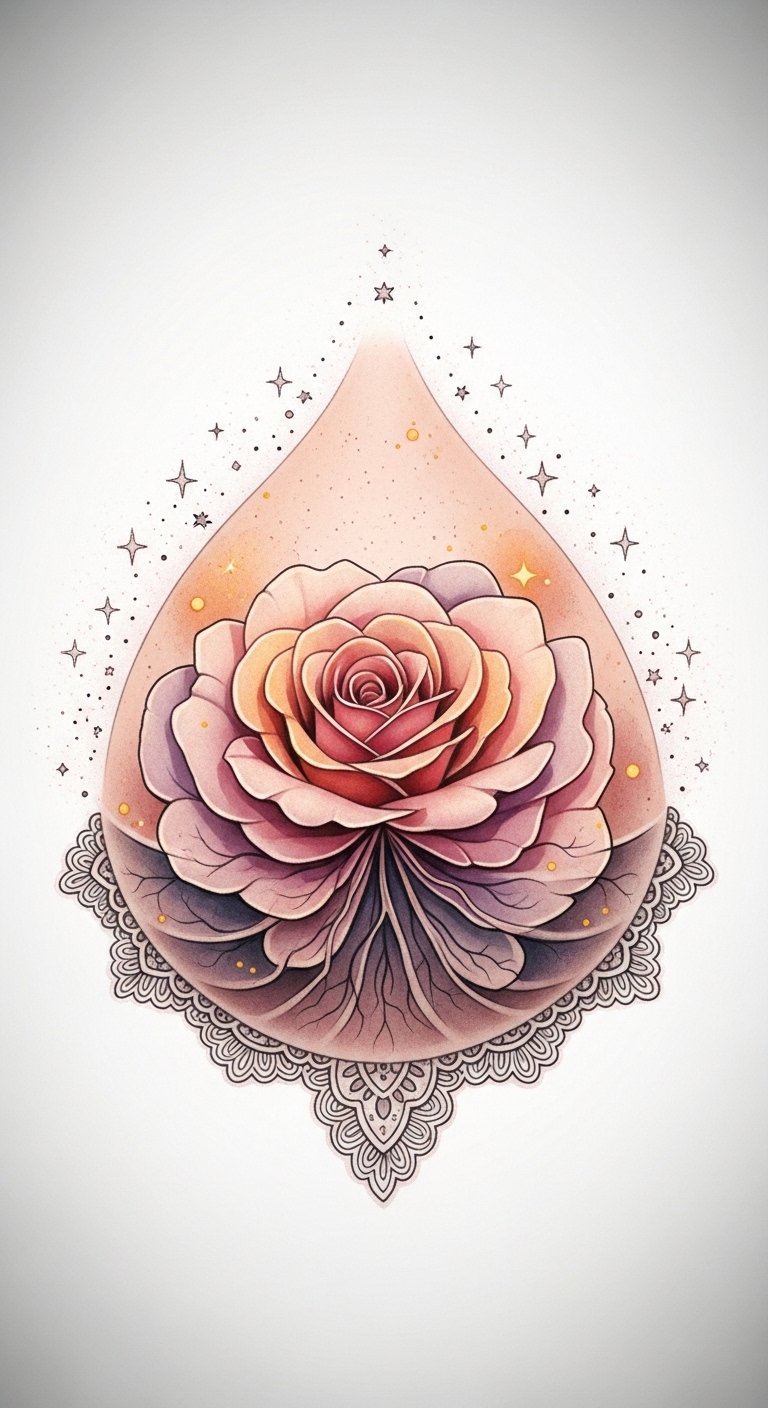 The design’s soft colors and subtle halo evoke tenderness and renewal, the lace edging hints at reclaimed femininity and personal adornment, and the realistic texture affirms authenticity; placed centrally on the reconstructed or natural breast, it serves as a focal point of healing and empowerment, intended to be both intimate and dignified.