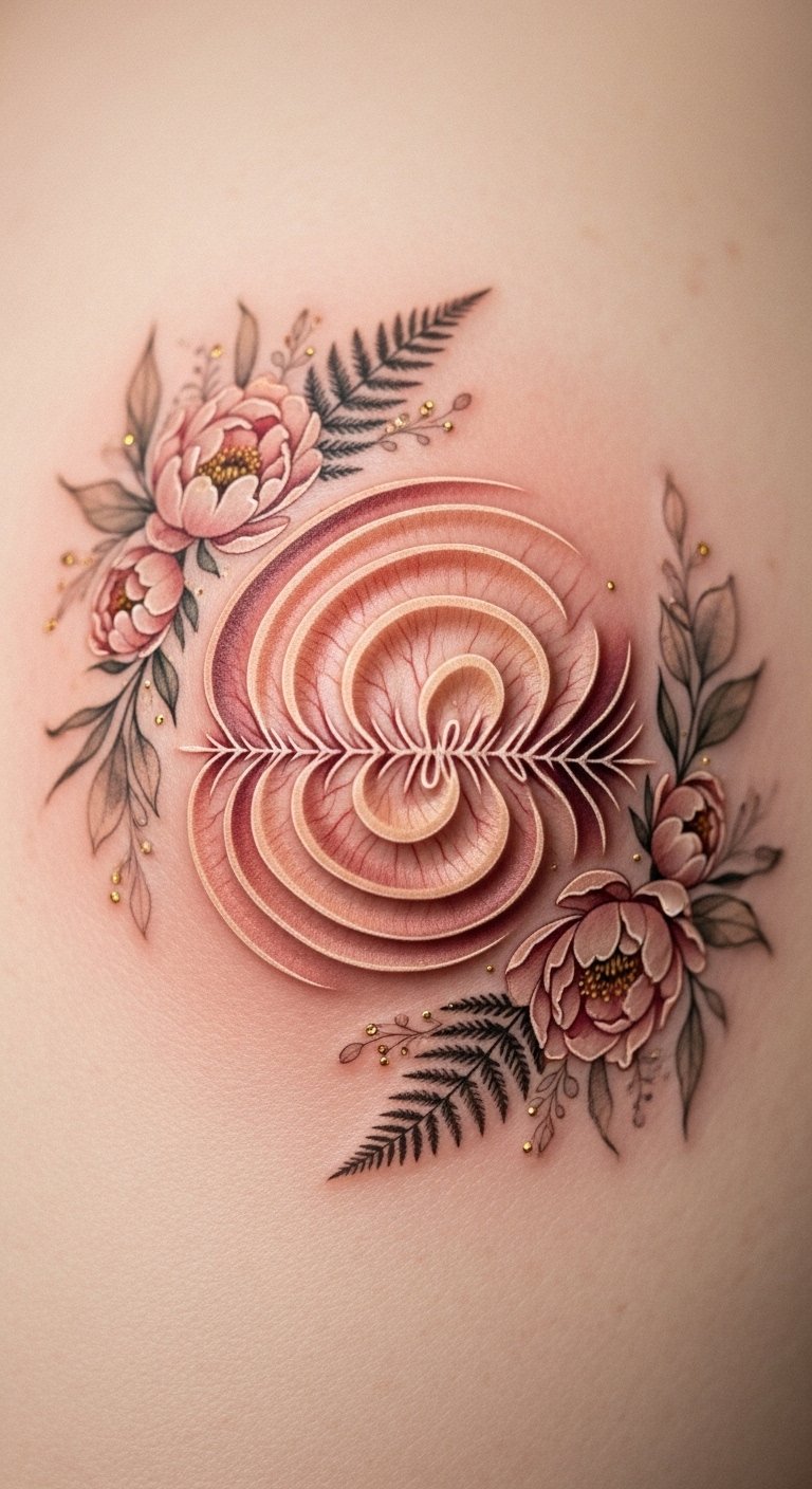 This design symbolizes restoration and gentle resilience—the warm concentric tones and microvascular detail replicate natural anatomy to evoke healing and self-acceptance, while the botanical filigree represents growth and renewal; the muted palette and soft 3D shading aim to create a soothing, intimate emotional response.