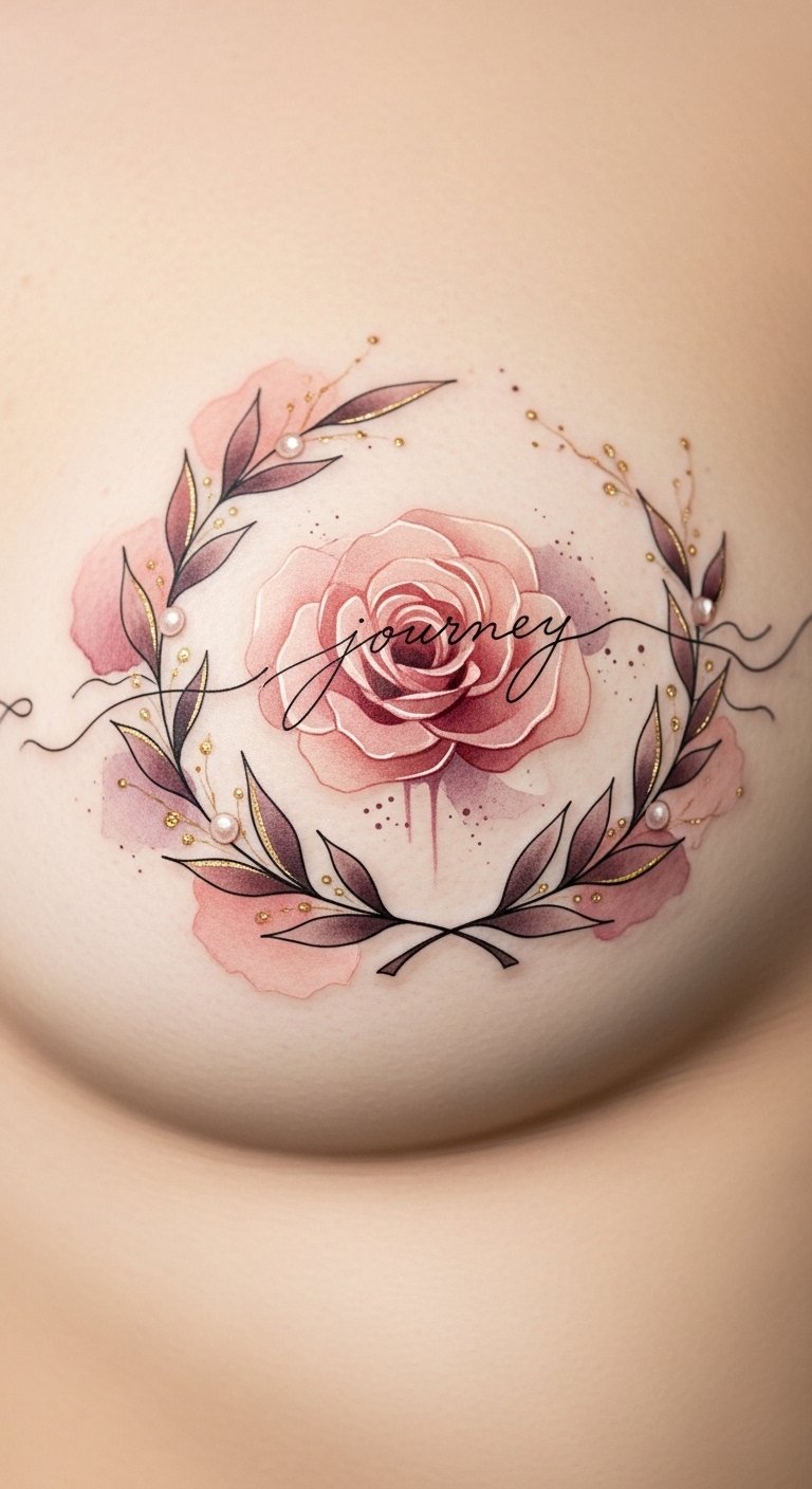 This design concept centers on a delicate, watercolor-style areola tattoo integrating subtle floral elements—peonies for healing, lavender sprigs for calm, and small golden rays suggesting inner light—rendered in soft pinks, muted purples, and warm gold accents to complement natural skin tones. Symbolically, the flowers and light represent growth, restoration, and renewed confidence; the watercolor texture conveys gentleness and acceptance, while the gold rays signify empowerment and joy. Emotionally the piece aims to evoke pride, liberation, and a tender reclaiming of the body. Placement is centered on the areola, sized to harmonize with the breast and follow natural contours so the imagery appears integrated and personal.