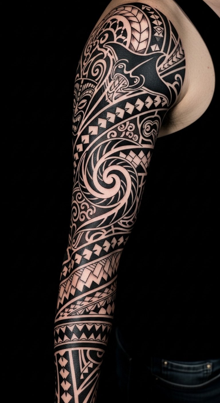 Waves, spirals, and geometric shapes embody concepts like strength, unity, and balance, inviting you to embrace your journey and express your individuality through stunning ink. This sleeve concept channels those themes: the waves signify life’s ebb and flow and resilience, the koru spiral represents new beginnings and personal growth, shark teeth bands convey protection and courage, and incorporated tiki faces honor ancestral guidance.