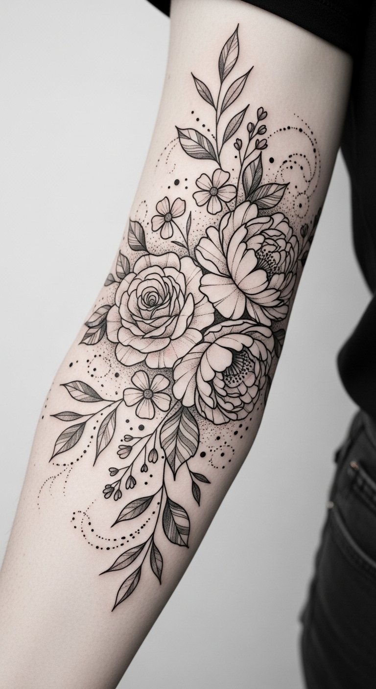 Soft earth-toned blooms and fine-line vines wrap the arm in a flowing band, symbolizing growth, renewal, and a deep bond with nature; the gentle movement of petals evokes freedom and serenity, while detailed textures speak to individuality and care. Emotionally the design offers calm confidence and connection—placed mid-forearm or upper arm where the curve enhances the spiral of blossoms, it reads both intimate and visible, blending personal meaning with elegant, wearable art.