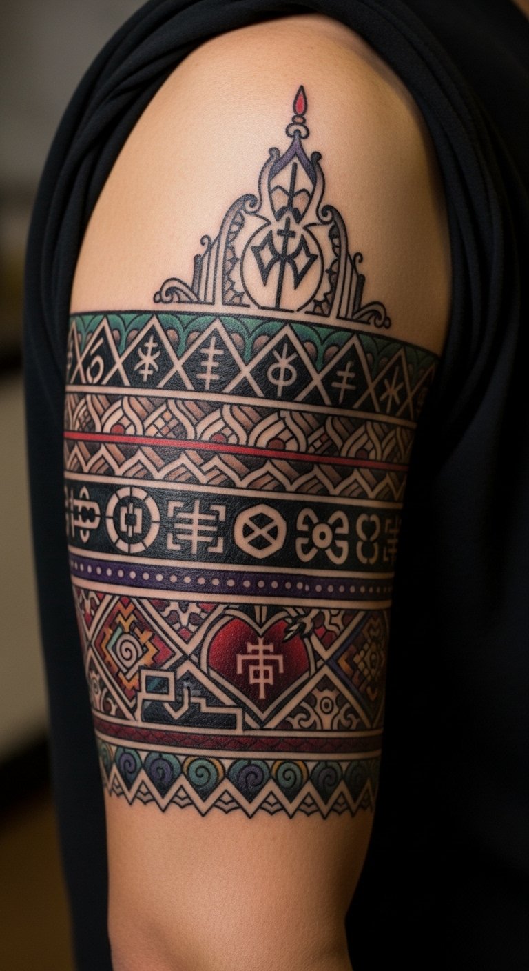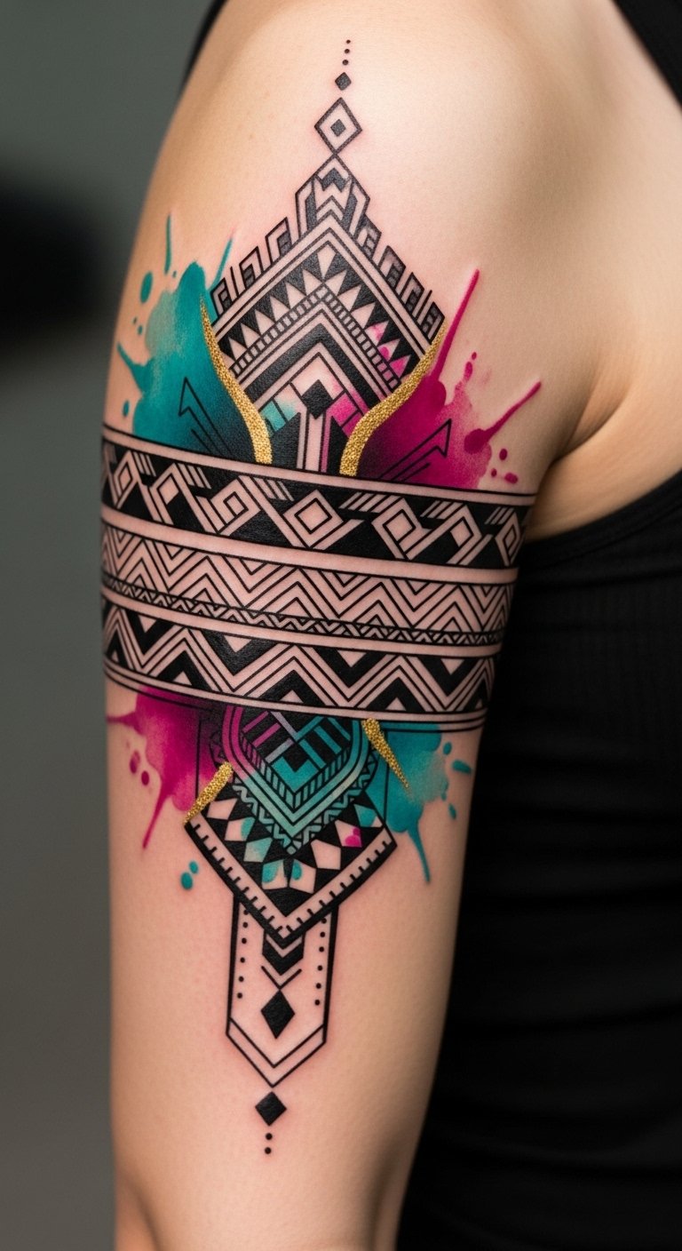 The design symbolizes heritage and personal evolution—bold tribal lines anchor identity, while vibrant washes and abstract forms represent growth, emotion, and modern influences; placed as a continuous band around the upper arm it reads as both a statement of belonging and a canvas for personal history, visible yet easily covered when desired.