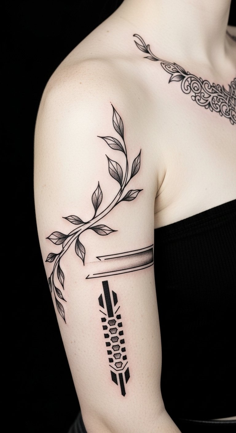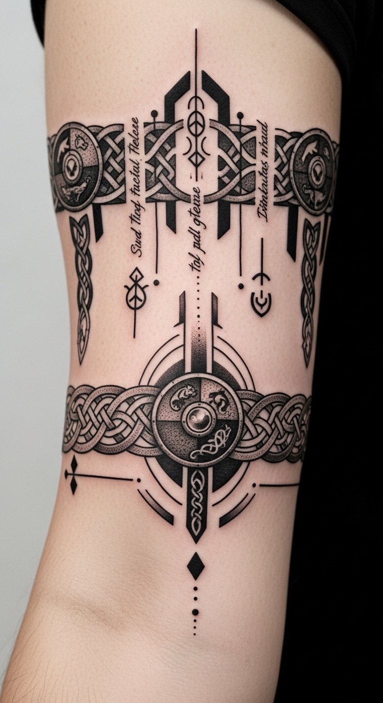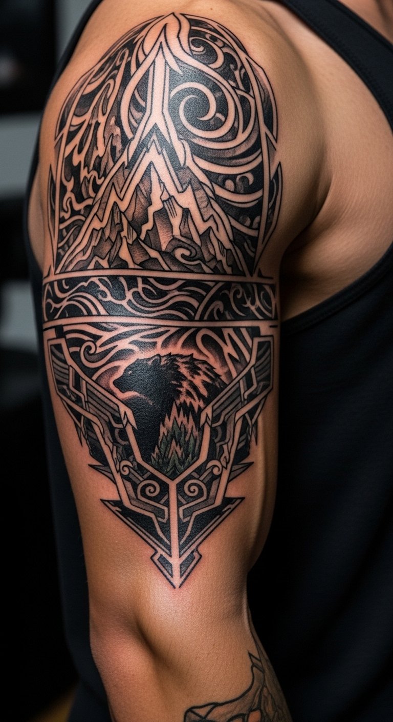 This design weaves ancestral strength and contemporary personal narrative into a continuous band that sits on the upper forearm, evoking resilience and heritage while allowing space for personal script or a meaningful motif; its placement makes it visible yet adaptable, carrying both protective symbolism and intimate emotion.