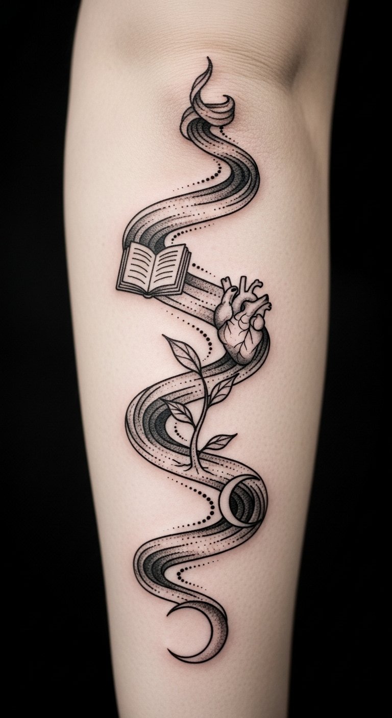 The design symbolizes continuity and personal evolution through flowing forms and deliberate gaps that represent growth and pauses; emotionally it aims to feel intimate and empowering, suitable for a mid-forearm placement where it can be easily seen or covered.