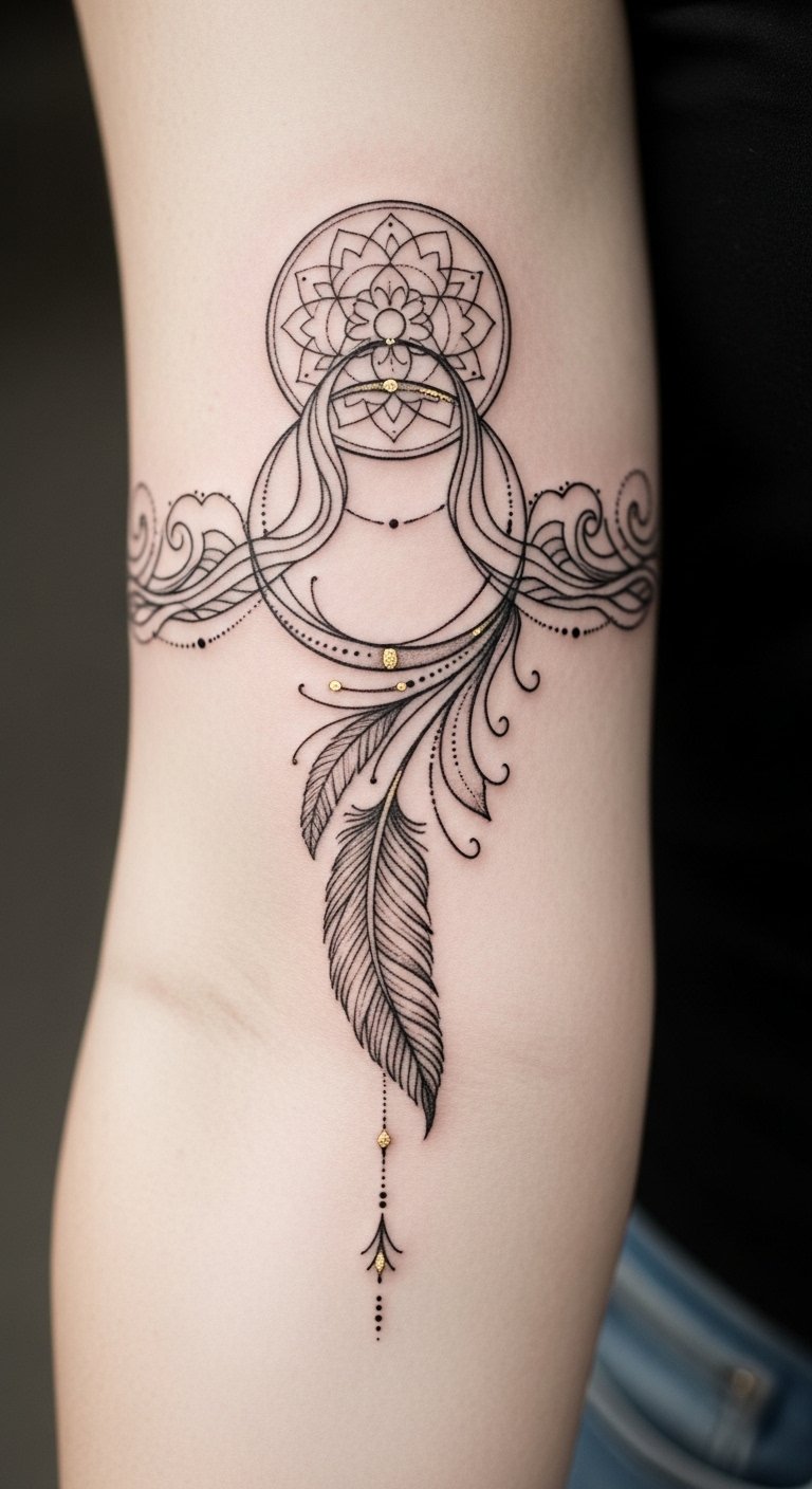The design’s mandala centers ground the piece in harmony and balance, the feathered vine and wave motifs evoke movement and liberation, and the negative space suggests openness and personal growth; emotionally it offers calm resilience and a visible pledge to inner values, best placed mid-forearm to allow visibility while remaining adaptable for wrap, inner-arm, or upper-arm placement.