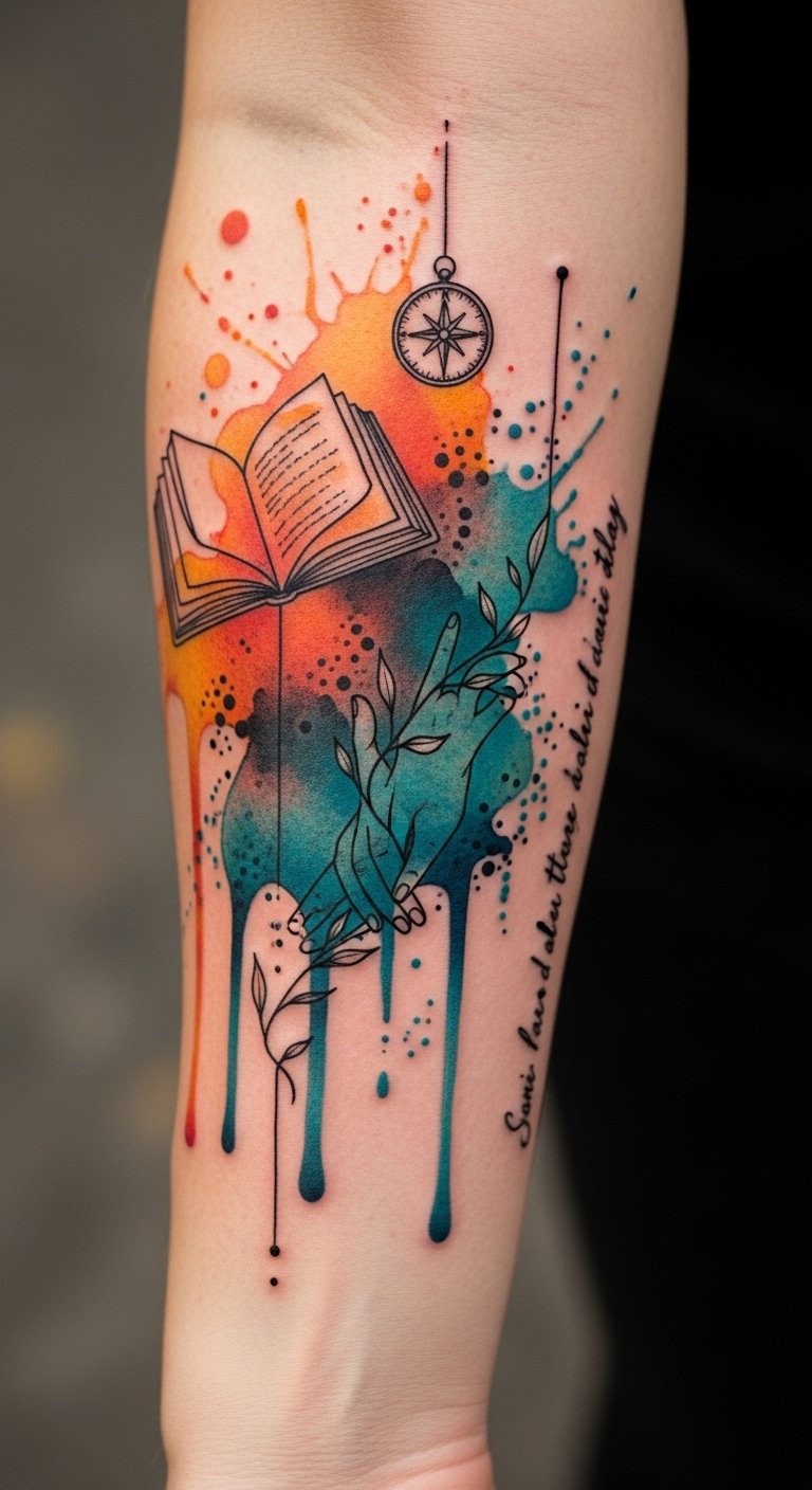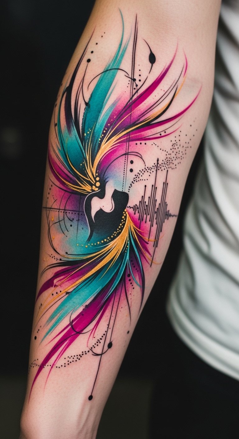 This design blends vibrant watercolor swashes with a central, intricate mandala to symbolize the balance between spontaneity and structure in your life; the watercolor hues (teal, magenta, gold) represent emotion and individuality, while the mandala’s geometry grounds them in purpose and harmony. Emotionally the piece speaks to self-discovery and celebration of personal narrative, inviting reflection and confidence. Ideal placements include the upper back or ribcage for a larger, flowing composition, or a scaled-down version on the forearm or calf to keep the movement and detail visible and intimate.
