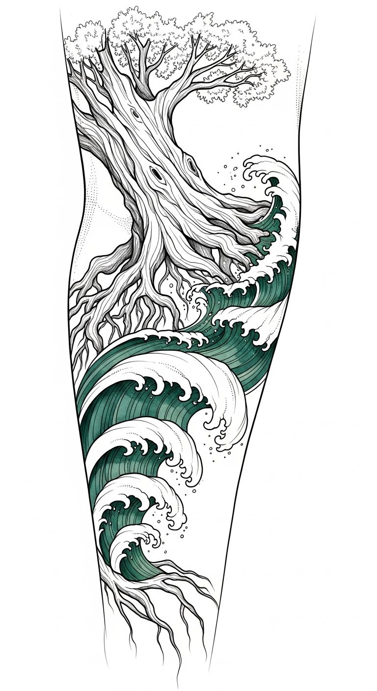 Nature’s embrace comes alive in the artistry of trees and waves tattoos, capturing the raw beauty and interconnectedness of the natural world.