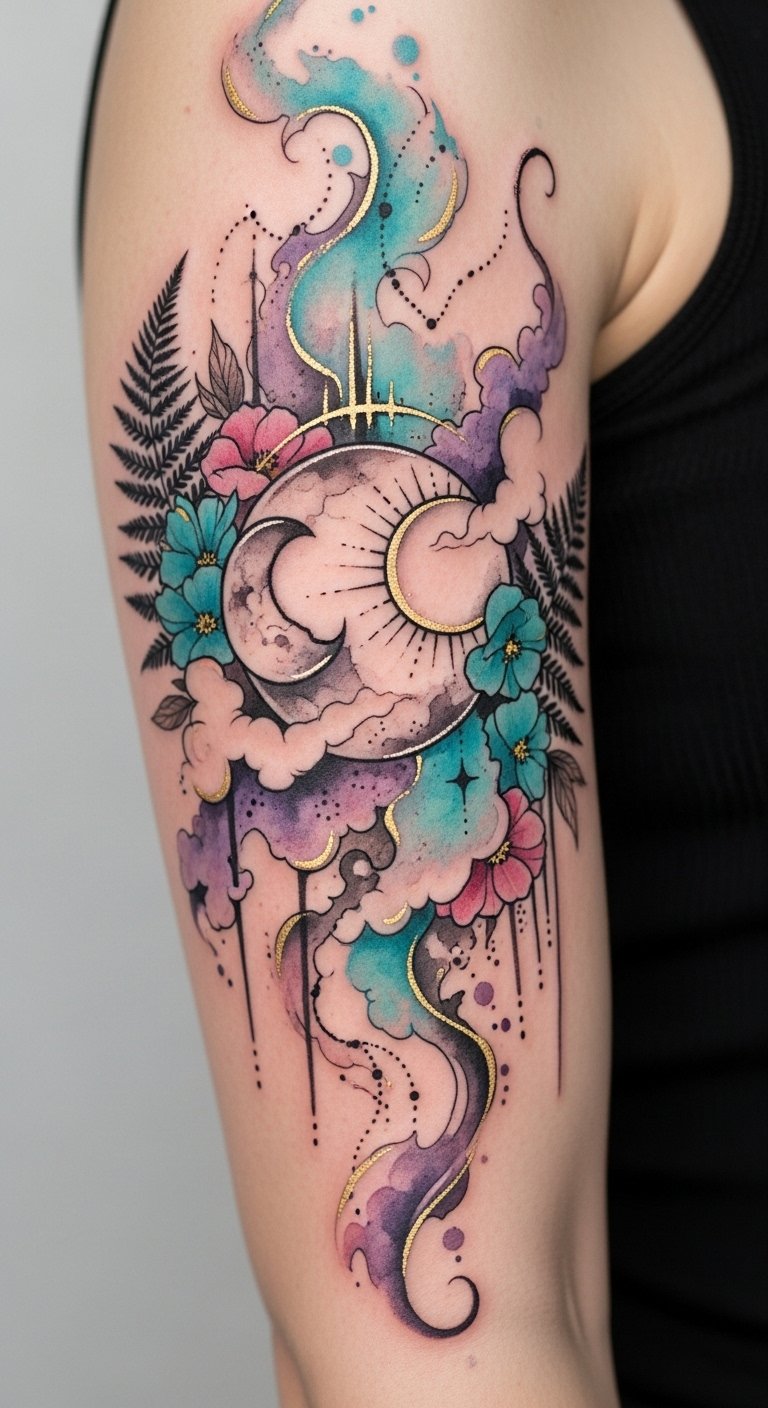 A delicate forearm or shoulder piece combining a blooming lotus with subtle celestial elements—faint crescent moon, tiny stars, and a soft comet trail—rendered in fine line black ink with watercolor washes in muted pastels; integrate small, personalized symbols (initials, dates, or tiny glyphs) nestled among petals to mark triumphs. This composition symbolizes continuous growth and inner strength, evoking quiet pride and gentle empowerment; placement on the forearm or shoulder makes it visible for personal affirmation yet easily covered, fostering a balance between public expression and intimate meaning.