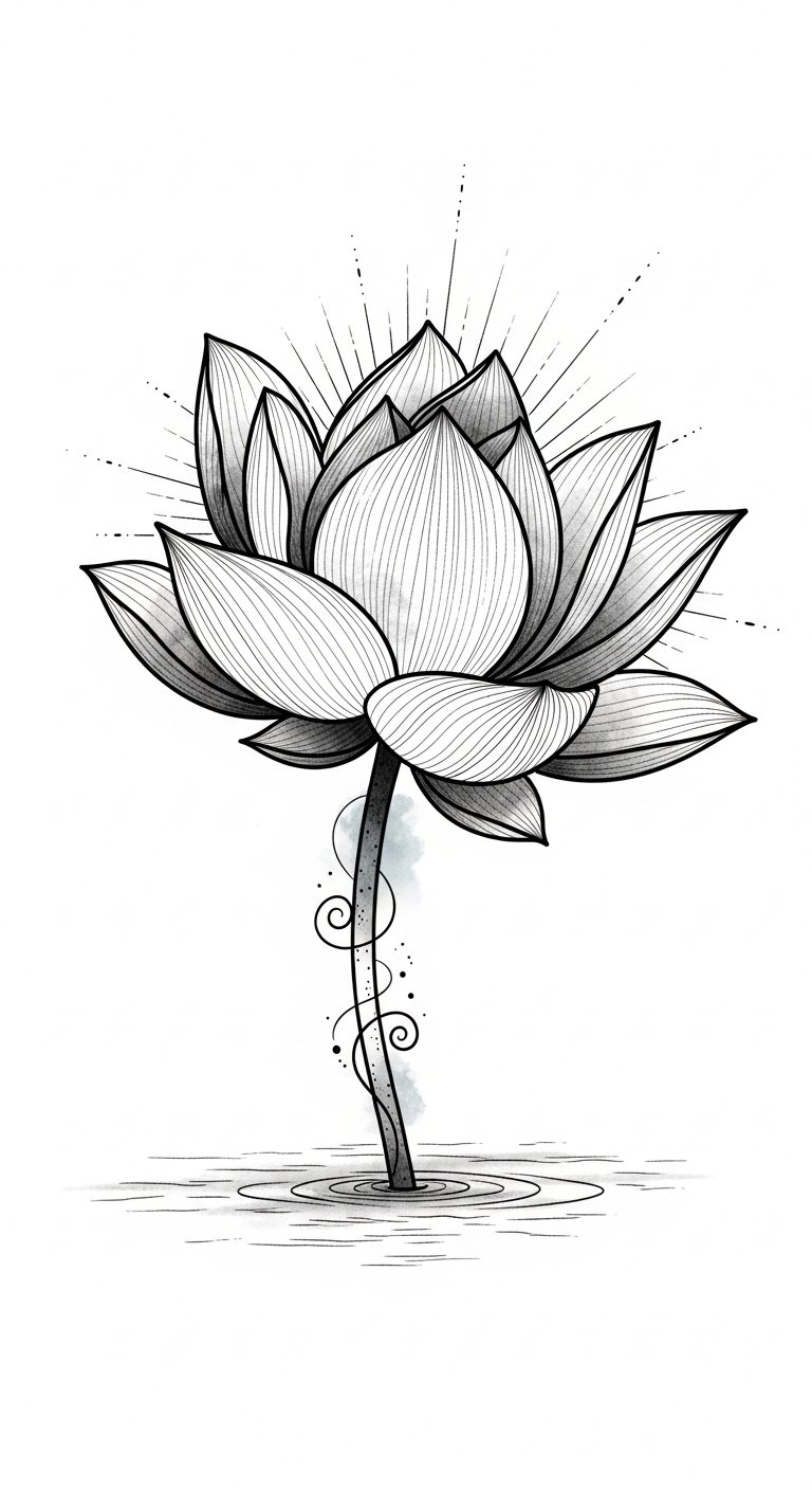 Each inked petal tells your story, reminding you of your strength and the ability to rise above challenges, blooming brilliantly in the face of adversity. This design emphasizes emergence and quiet strength—soft light and subtle mud texture evoke the transition from struggle to clarity; the fine-line detail and muted blue wash convey calm and introspection.