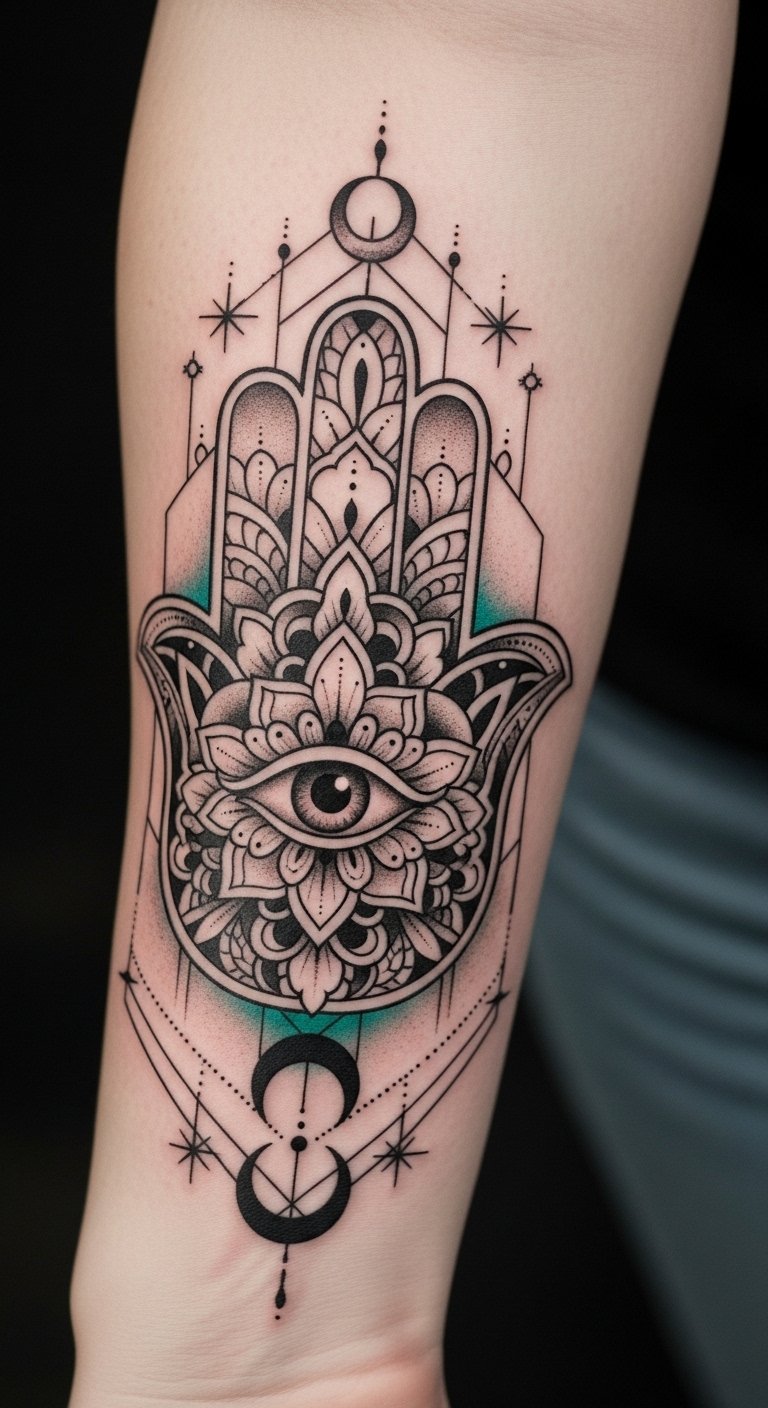 With its rich Hamsa symbolism, this design serves as a powerful reminder of resilience and hope. Protective tattoos featuring the Hamsa invite good fortune while celebrating your unique spiritual meanings.