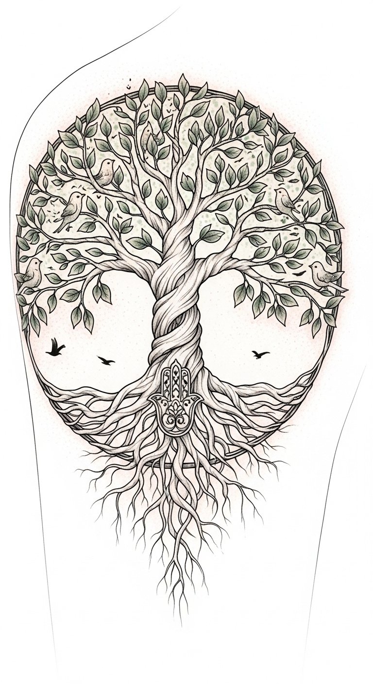 The design evokes grounded strength and flourishing hope; the hidden Hamsa elements suggest protection woven into personal history, while birds and branches convey freedom and ongoing growth.