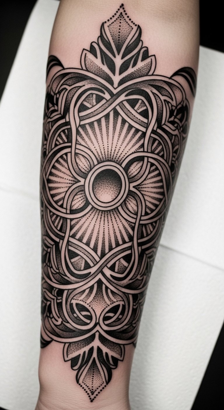 This forearm wrap concept uses interlocking mandala geometry to symbolize unity and inner balance, while the organic vine elements represent growth and resilience; the high-contrast stippling evokes quiet intensity and meditative focus, guiding the eye along the arm and allowing the wearer to reveal or conceal layers of personal meaning depending on placement and pose.