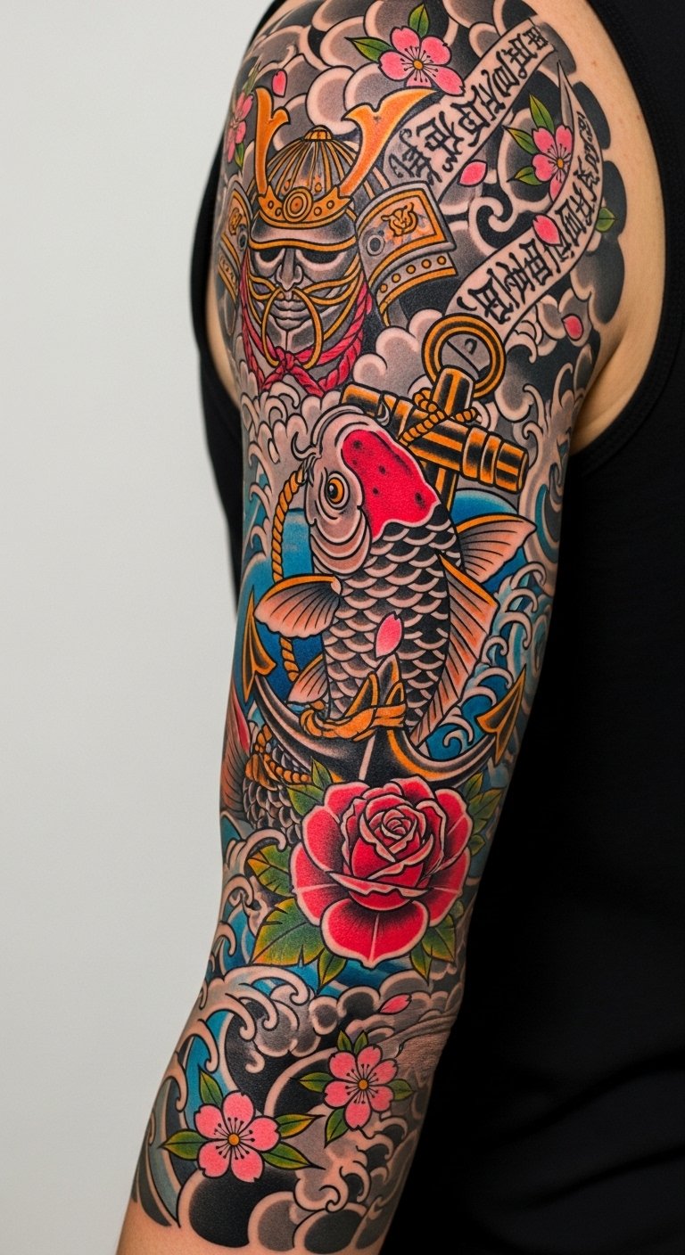 Japanese motifs, like koi and cherry blossoms, reflect life’s journey and impermanence, igniting your creativity and inviting you to express your own unique narrative through meaningful ink. This sleeve concept combines those elements to symbolize perseverance (koi swimming upstream), steadfastness and remembrance (anchor and rose), and the transience of life (cherry blossoms).