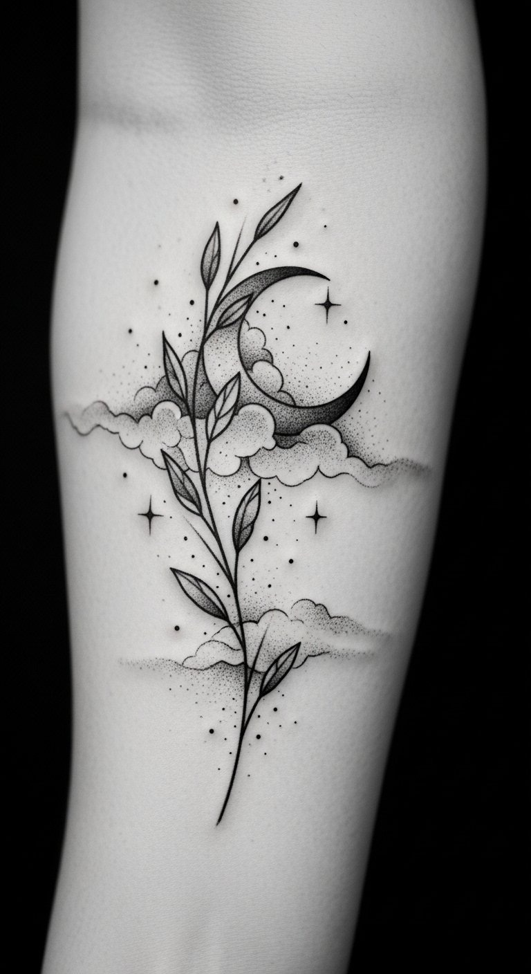 This design uses the willow and crescent moon to symbolize flexibility, healing, and cyclical rebirth; the soft clouds and stars add quiet hope and guidance while the restrained palette and fine dotwork convey introspection and calm.