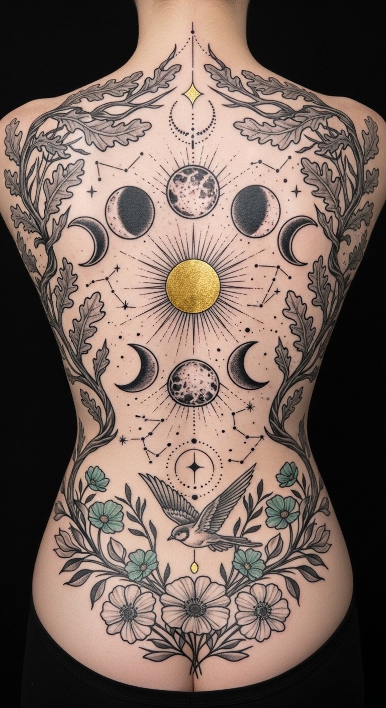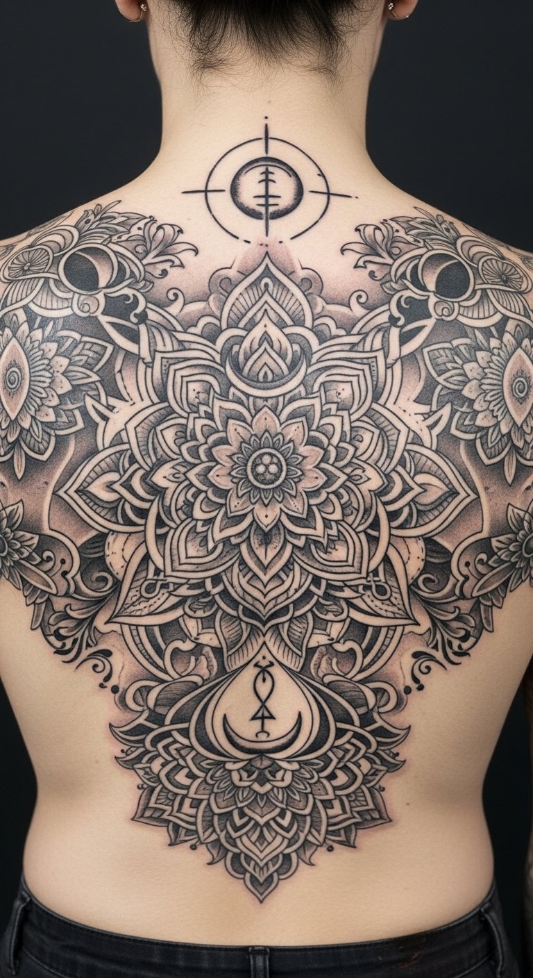 As you explore the vast canvas of your upper back, imagine the intricate designs that can unfold, telling a story as unique as your own journey. Embrace spiritual synchronicity through mandalas or celestial motifs, celebrating your individuality. This space offers artistic freedom, allowing you to weave together personal symbols and nature-inspired imagery, creating a harmonious balance that resonates deeply with your essence. The design centers a large, finely-detailed mandala at the spine base, radiating outward into delicate celestial elements (moon phases, subtle stars) and botanical filigree that follow the shoulder blades’ contours; it symbolizes inner harmony and personal growth, evokes calm empowerment, and places the most detailed work where clothing can reveal or conceal it.